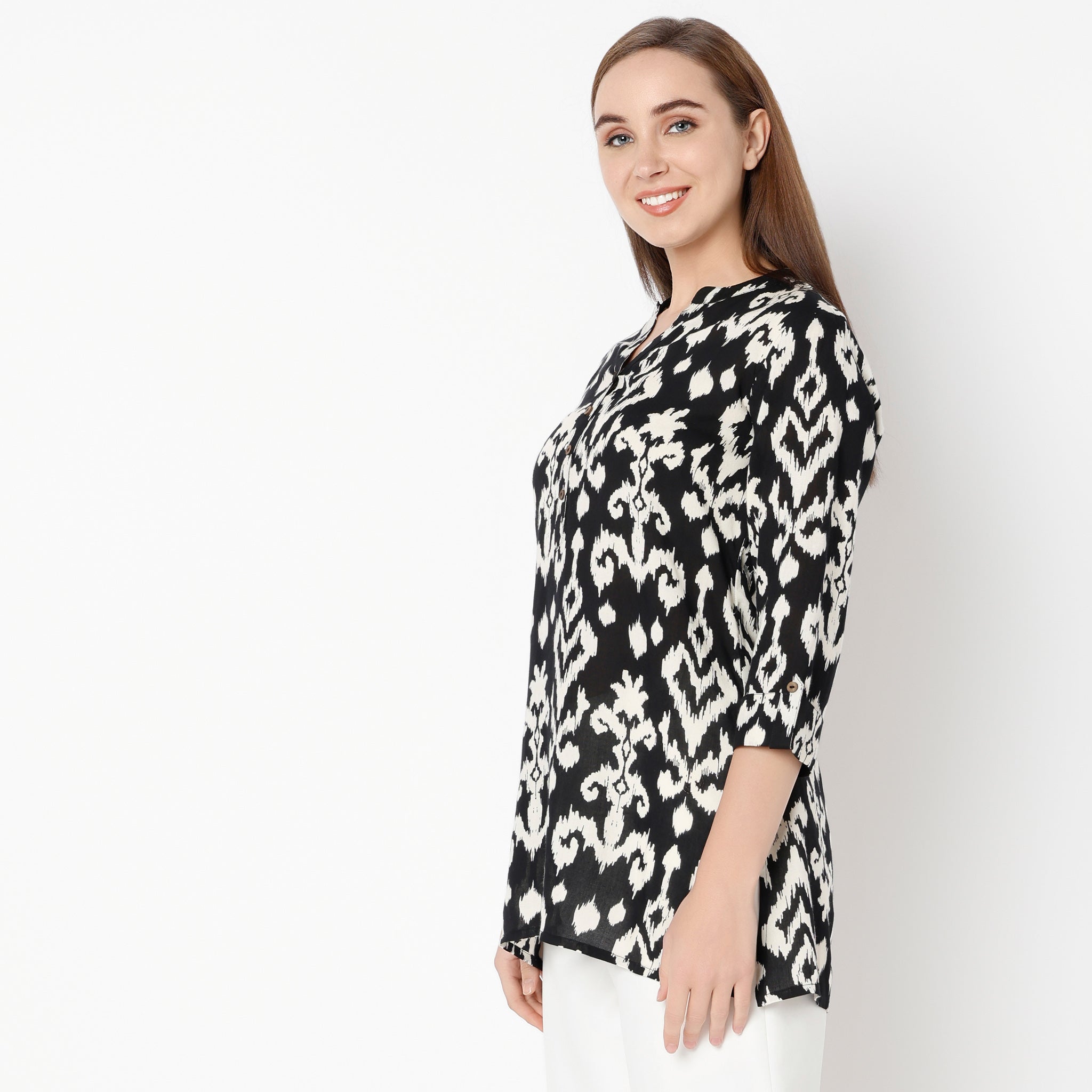 Band Neck Three-Fourth Sleeve Straight Fit Printed Short Kurta