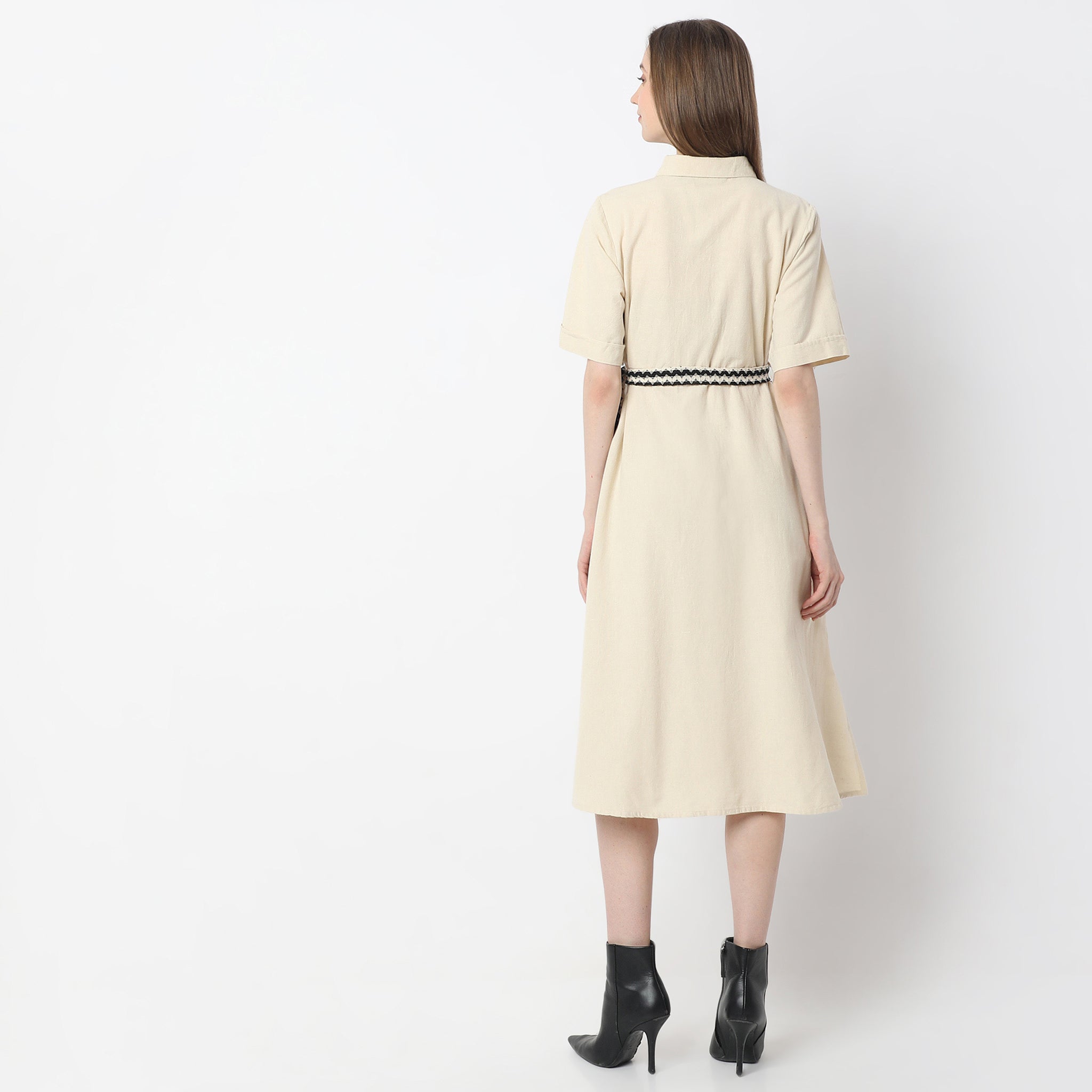 Experience the perfect blend of elegance and comfort with our Below Knee Elegant Shirt Collar Dress. Crafted from 100% cotton, this dress offers a breathable and soft touch against your skin, making it ideal for all-day wear. The solid pattern and woven texture add a touch of sophistication, while the elbow sleeves provide a modest yet stylish look. Whether you're heading to a business meeting or a casual outing, this dress is your go-to choice for a polished appearance.