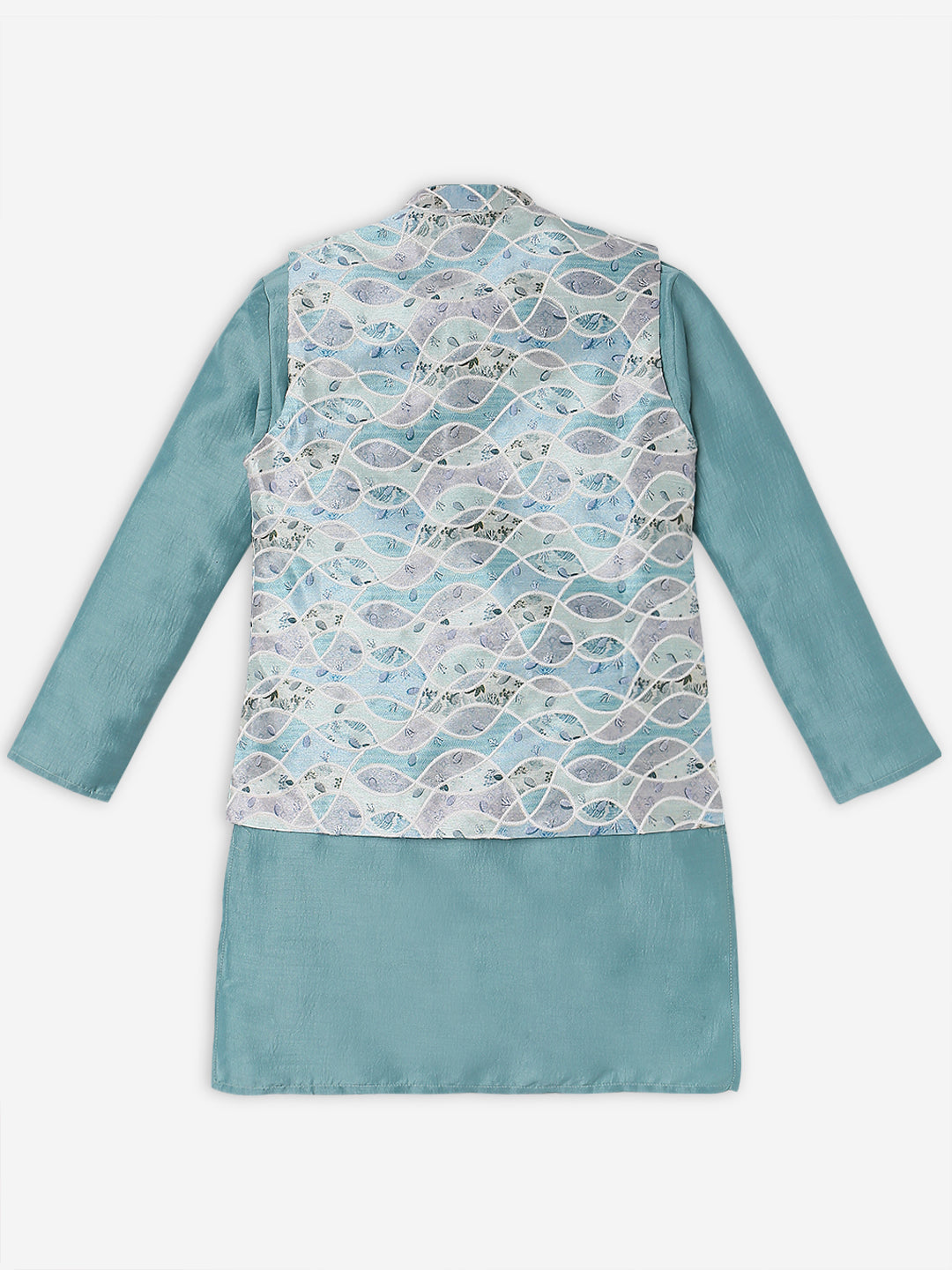 These printed pattern kurta with pant set has mandarin collar and full sleeve. Made from polyester, your kid's feel comfortable wearing the product.