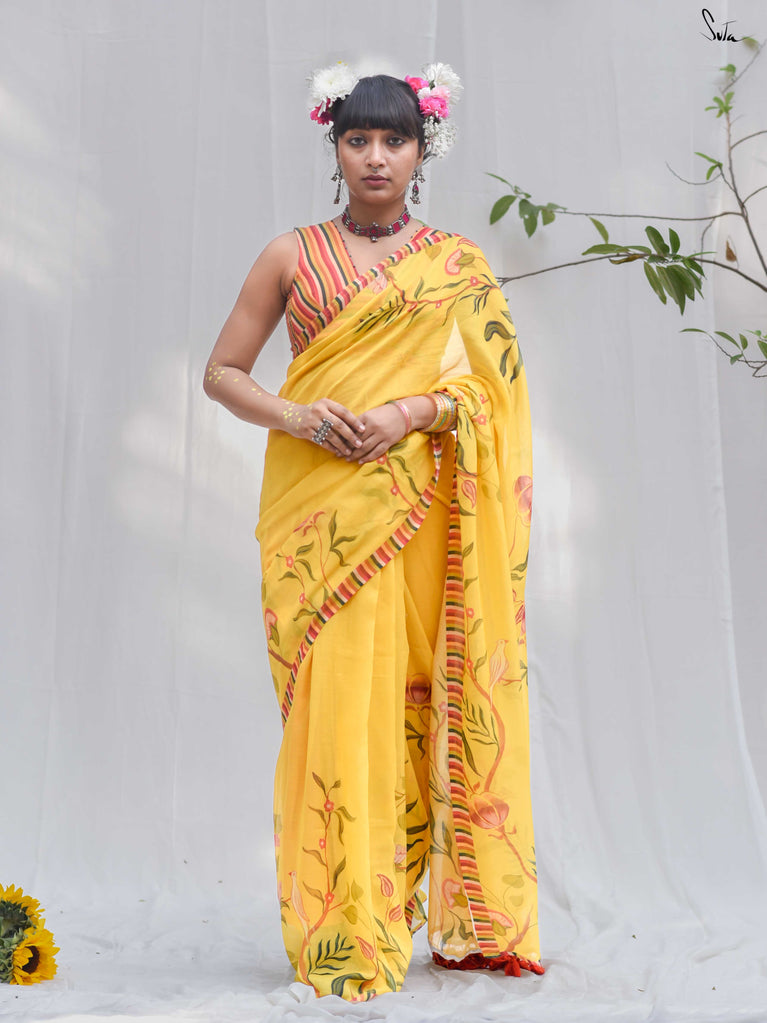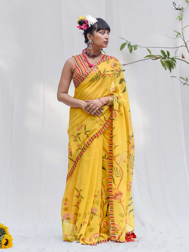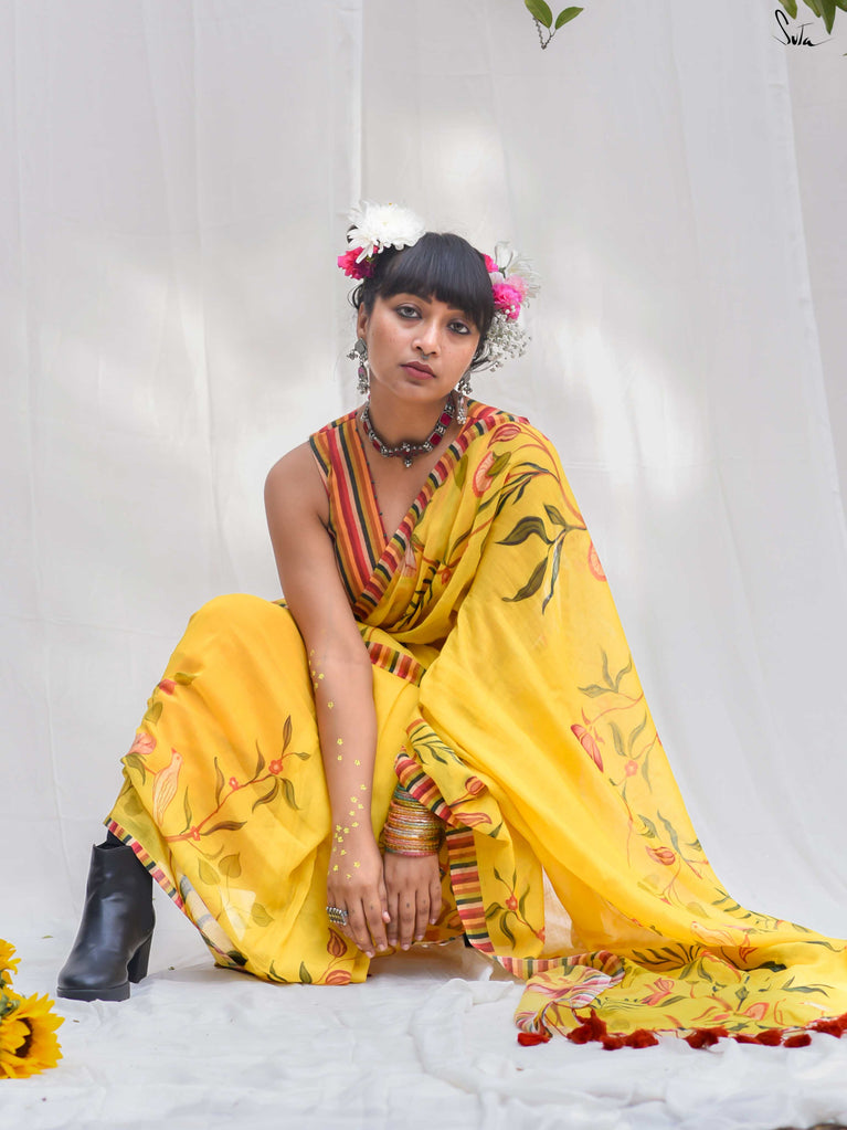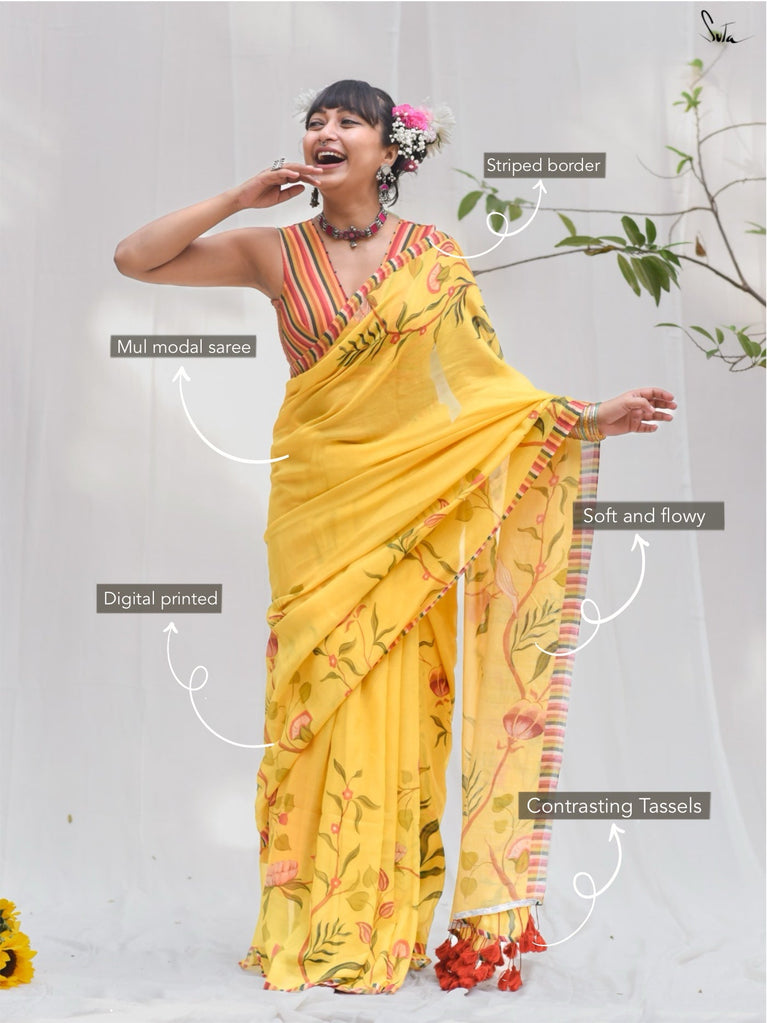 Inspired by the first gentle warmth of spring, this saree carries branches, florals and little birds in bloom. The mul-modal drape is light, airy and soft on the skin, making it effortless for everyday wear. Bright rust tassels add a playful touch, like kaner blossoms catching the sun.