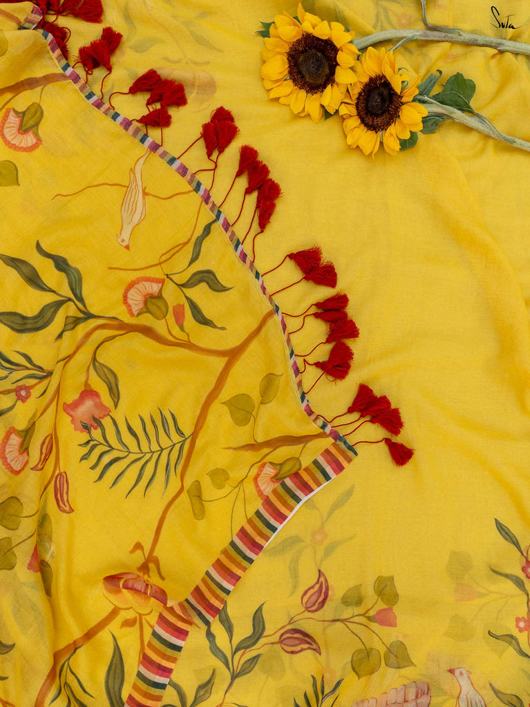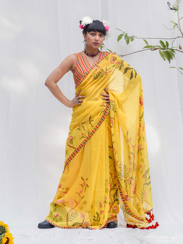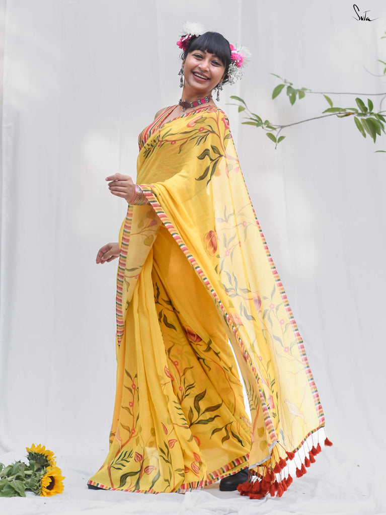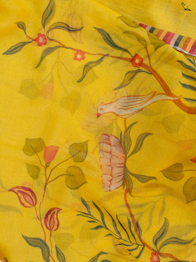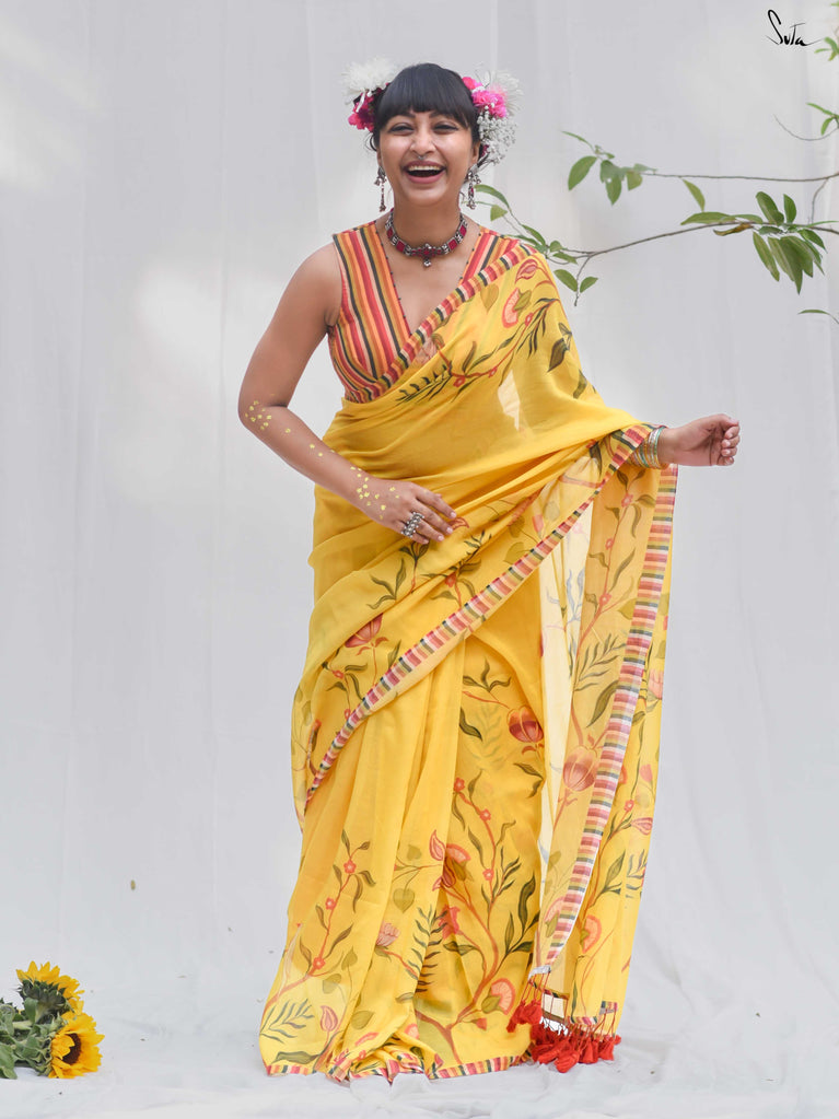 Inspired by the first gentle warmth of spring, this saree carries branches, florals and little birds in bloom. The mul-modal drape is light, airy and soft on the skin, making it effortless for everyday wear. Bright rust tassels add a playful touch, like kaner blossoms catching the sun.