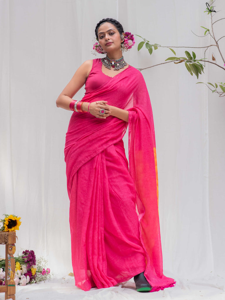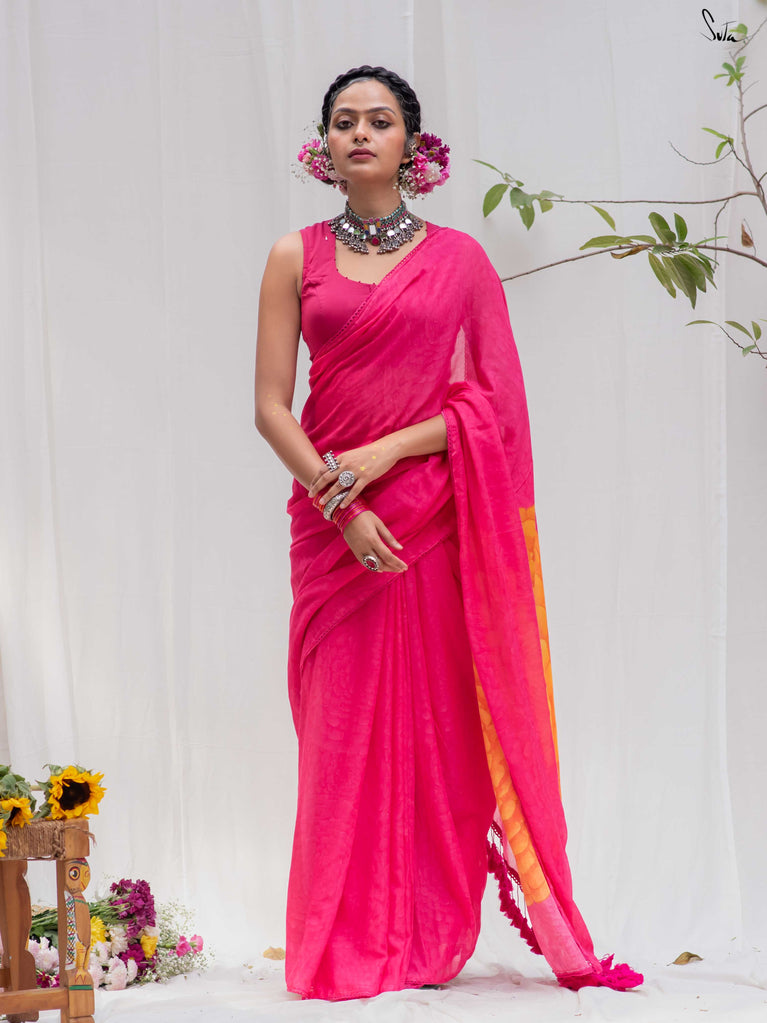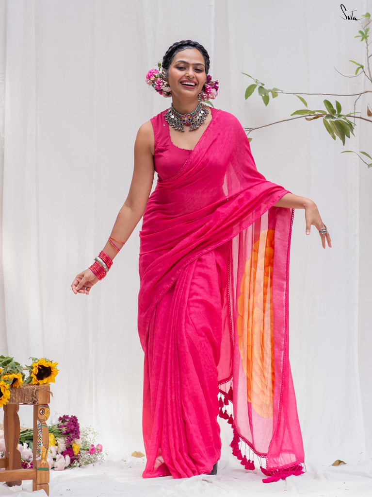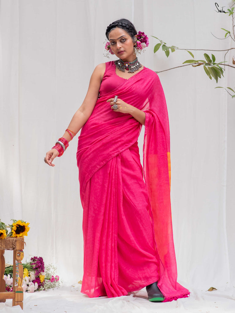 Don't miss this yummy shade of arresting dragon fruit pink on your favourite Made in Heaven mul cotton saree!