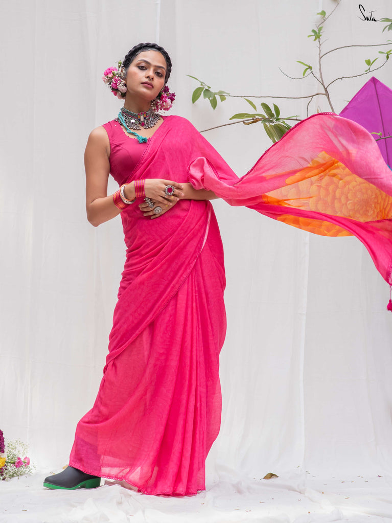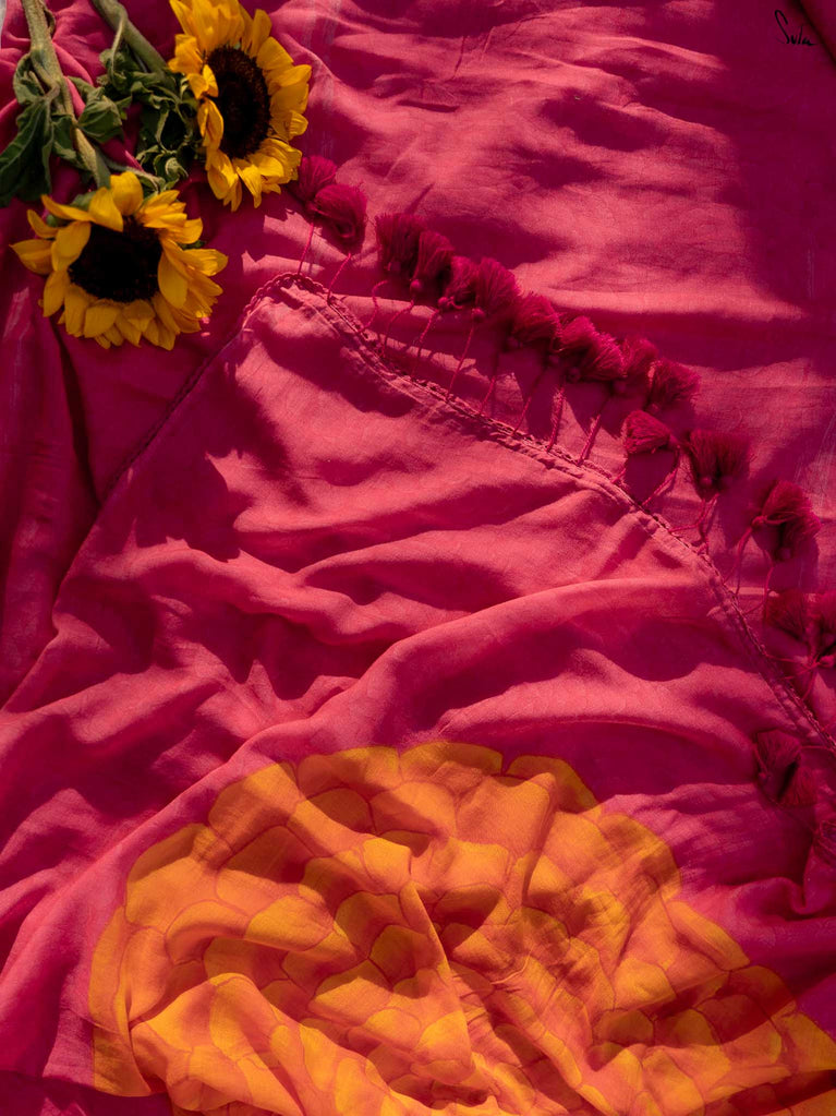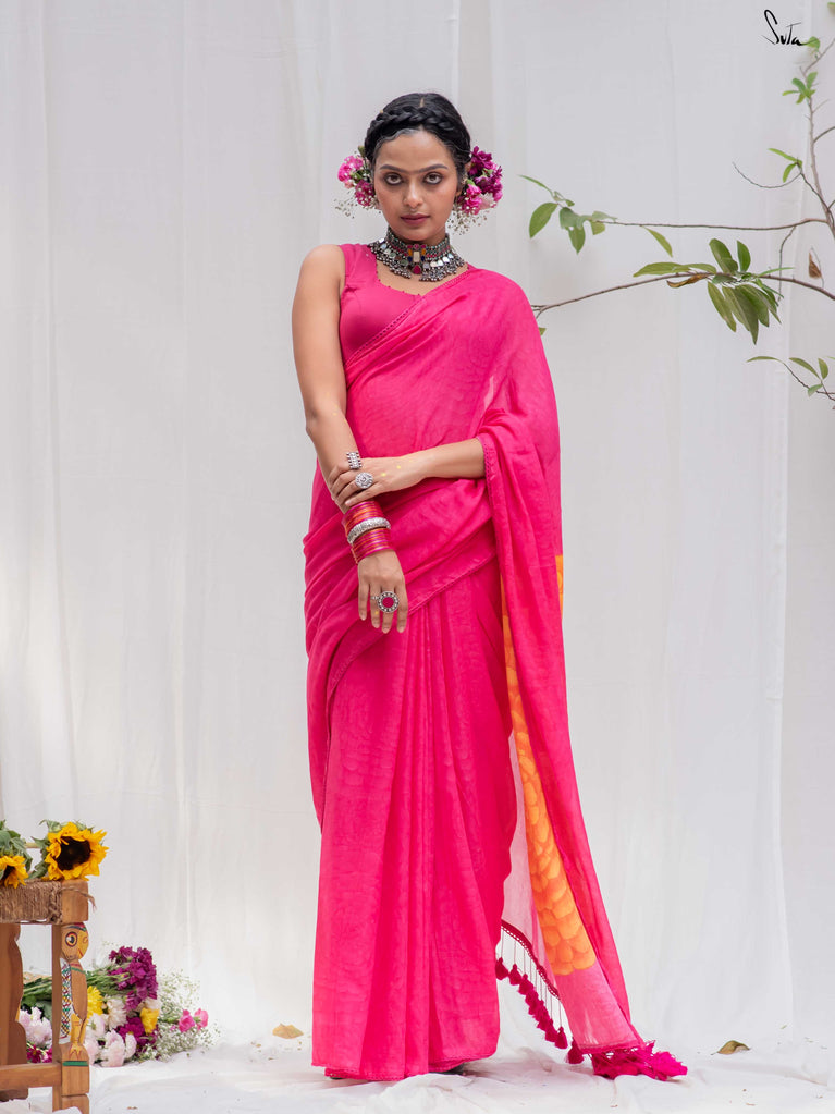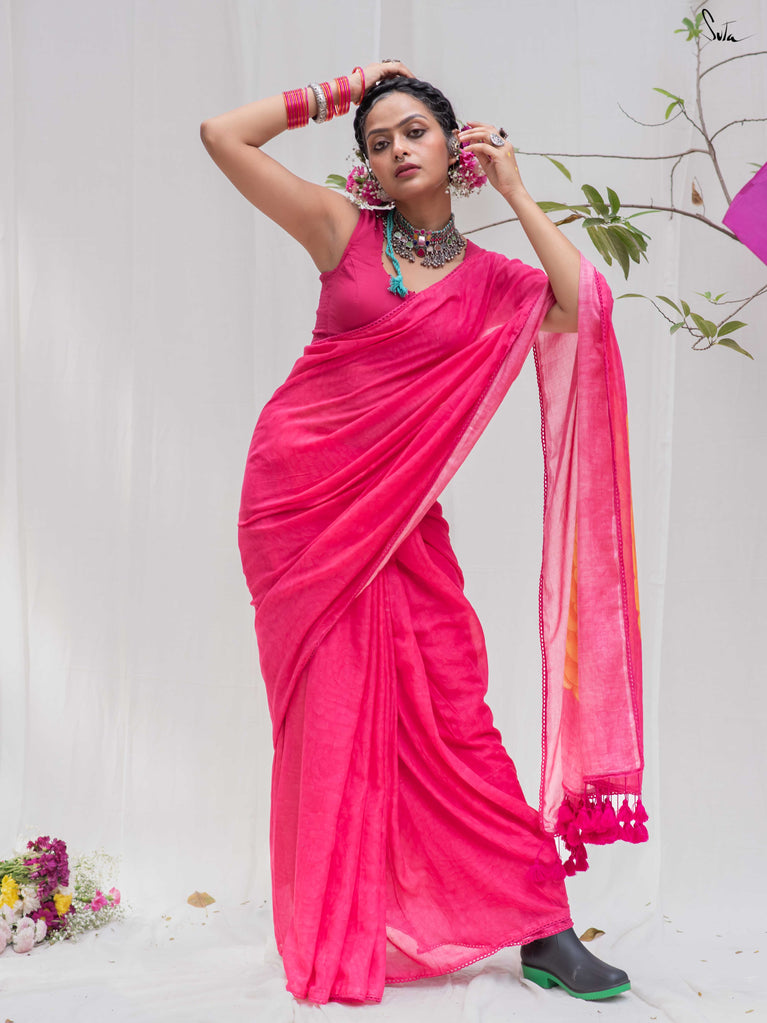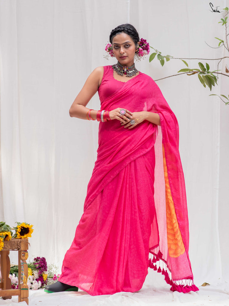 Don't miss this yummy shade of arresting dragon fruit pink on your favourite Made in Heaven mul cotton saree!