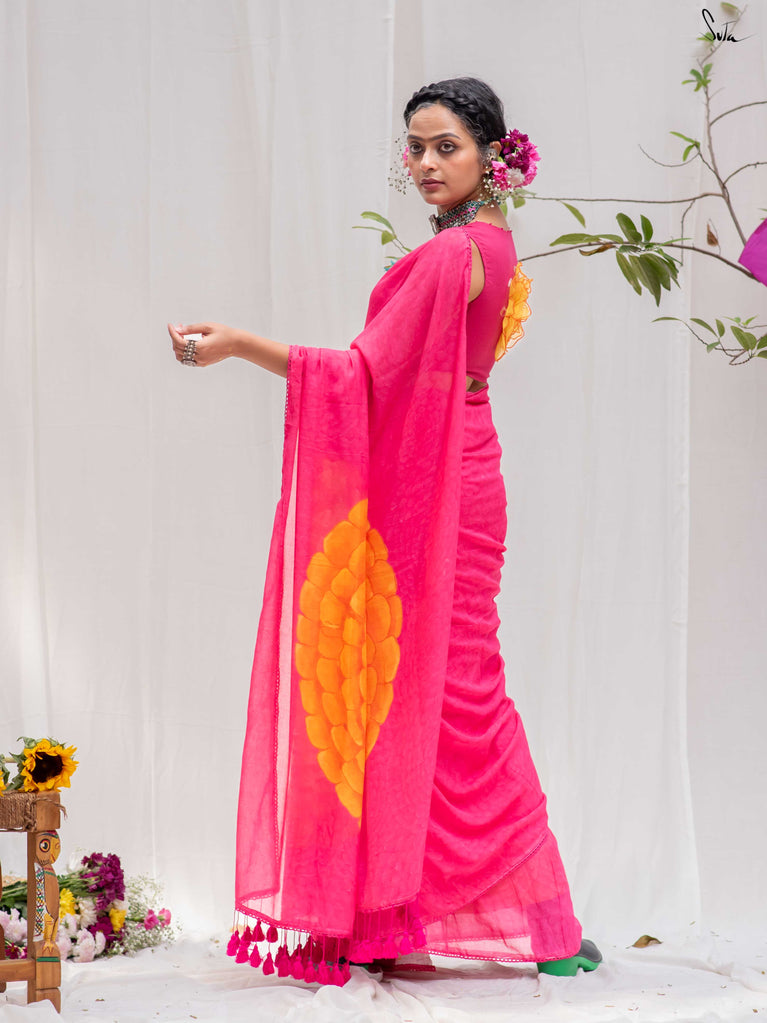 Soft, bright, and joyfully full of life, this saree draws from the warm vibrance of marigold blooms. The mul-modal drape feels fluid and feather-light, while the delicate crochet lace adds a sweet, handcrafted touch. Pink tassels finish the look with a gentle nod to spring’s playful charm.