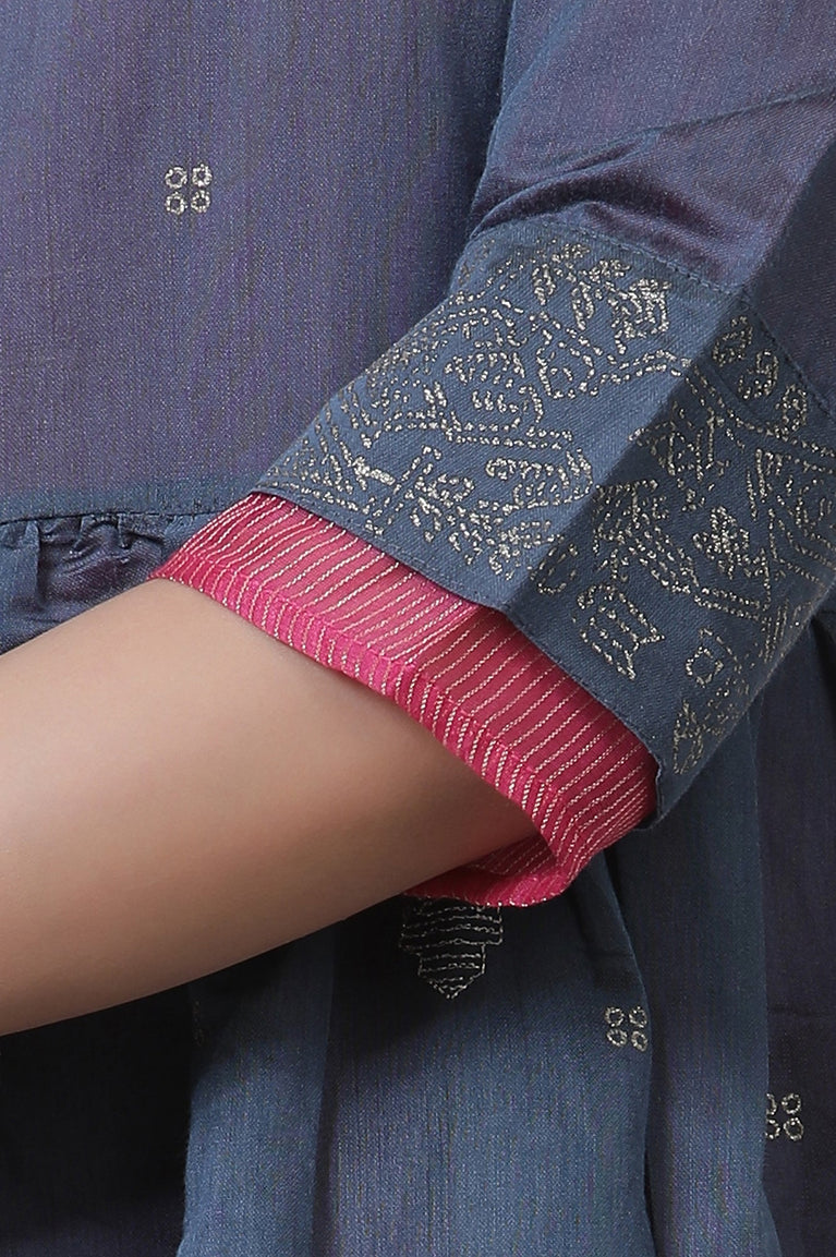 Get the elegant look by wearing this blue modern ethnic set. This set inludes blue printed satin kurta having metallic embroidery. The kurta is coordinated with parallel pants and dupatta.