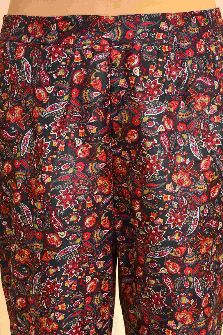 Revamp Your Traditional Wardrobe With This Elegant Yet Stylish White kurta Set. This Contemporary Set Includes Black Chanderi kurta In Floral Motifs And A-Line Silhouette. It Is Coordinated With Black Slim Pants In Mid-Rise And Partially Elasticated Waistband.