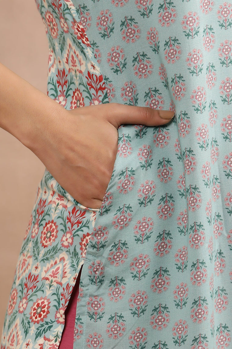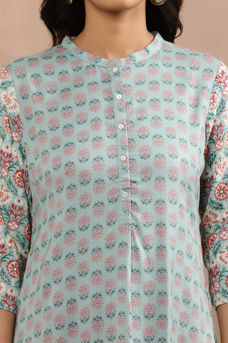 Sky Blue Printed Coord Set In Rayon Flax. It Includes An A-Line kurta With A Keyhole Neckline, Which Is Embellished With Print All Over And Comes With Matching Parallel Pants.
