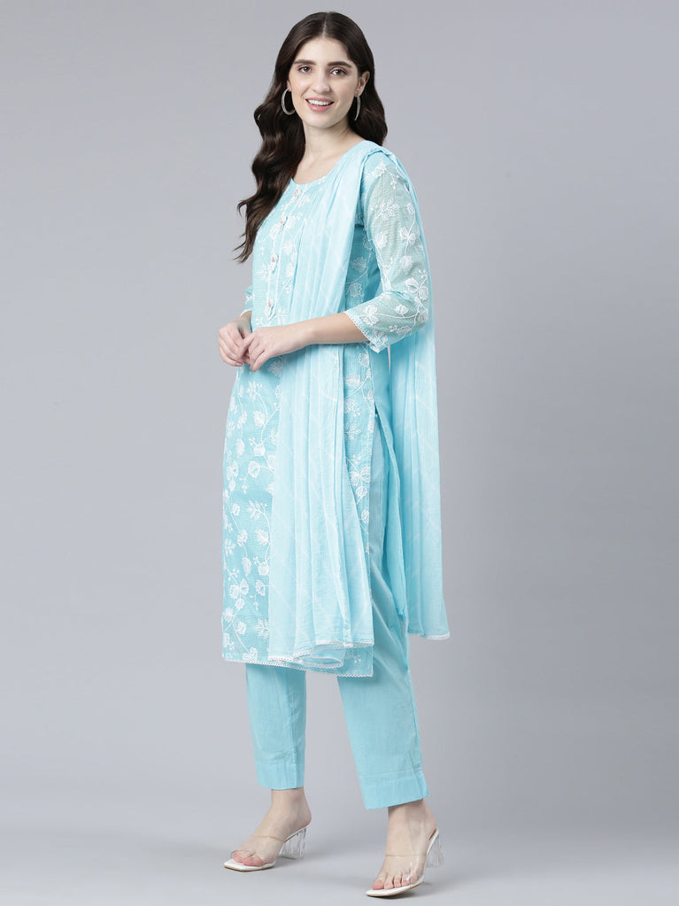Neeru's Blue Regular Straight Embroidered Kurta And Trousers With Dupatta