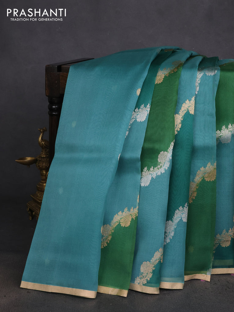 Banarasi organza silk saree teal green with rangakt weaves and zari woven piping boder