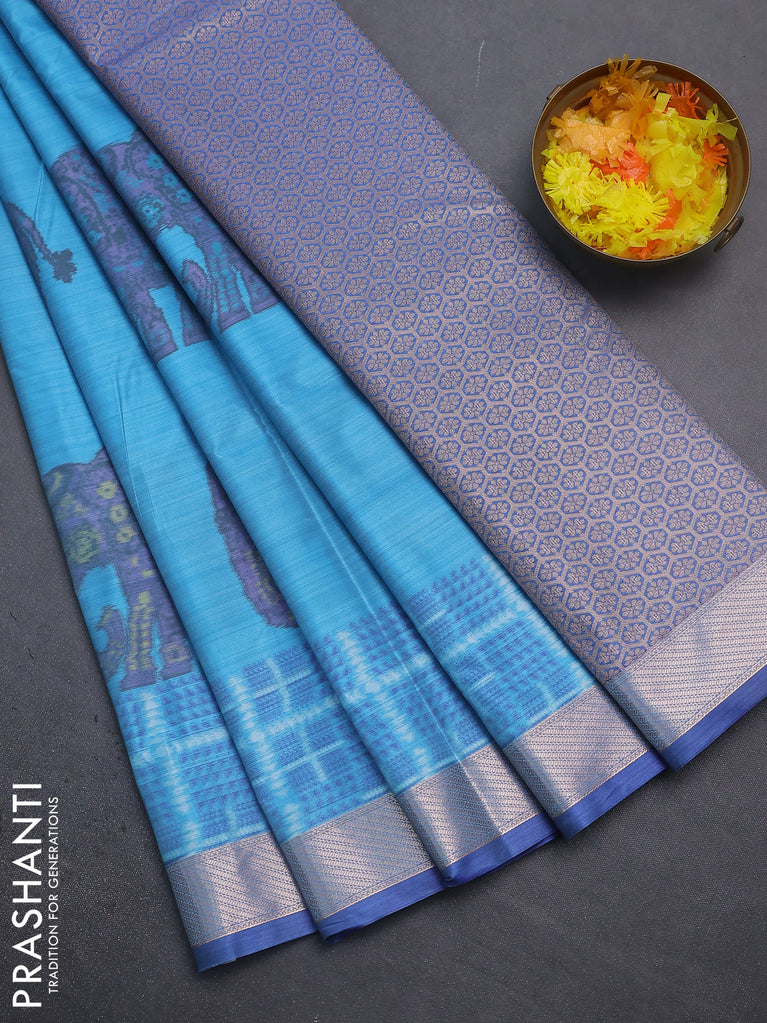 Bangalori semi silk saree light blue with allover elephant ikat butta weaves and zari woven border