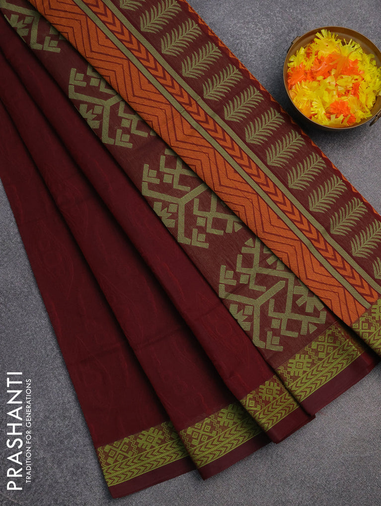 Coimbatore cotton saree maroon and sandal with allover self emboss and thread woven border