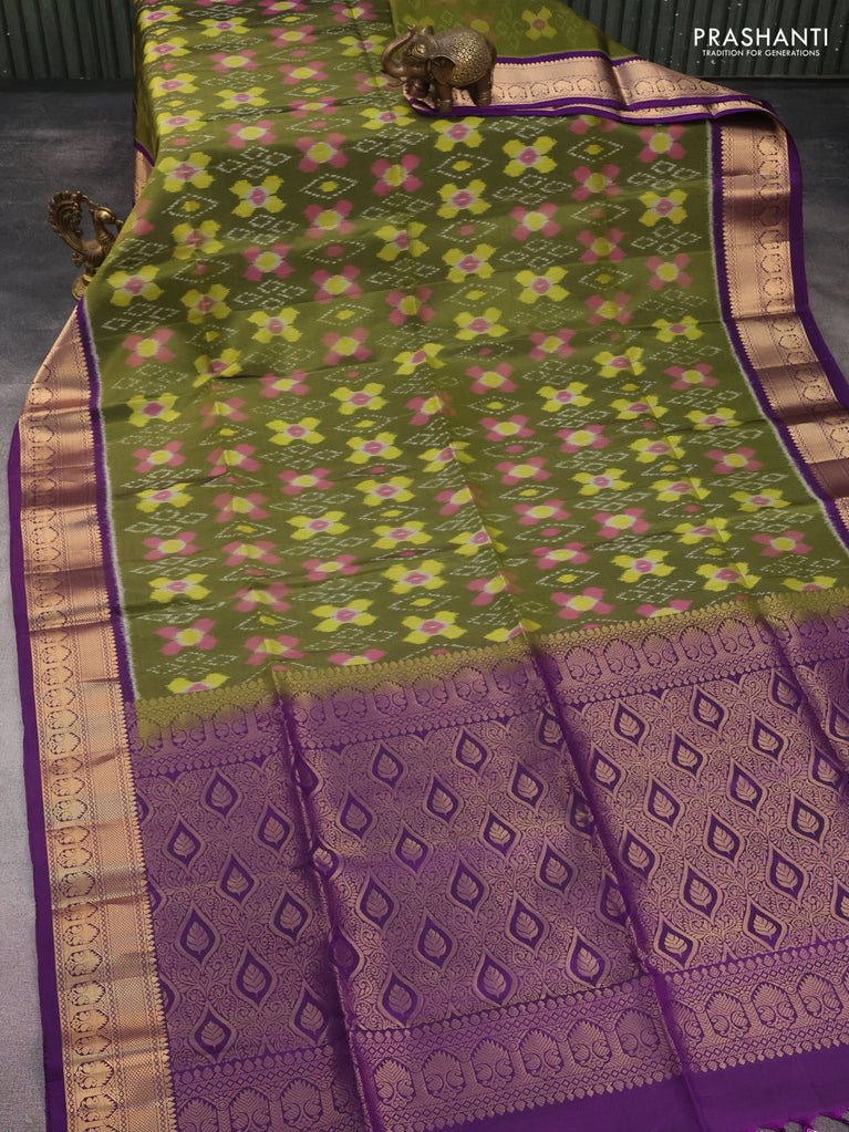 Ikat soft silk saree sap green and violet with allover ikat weaves and zari woven border
