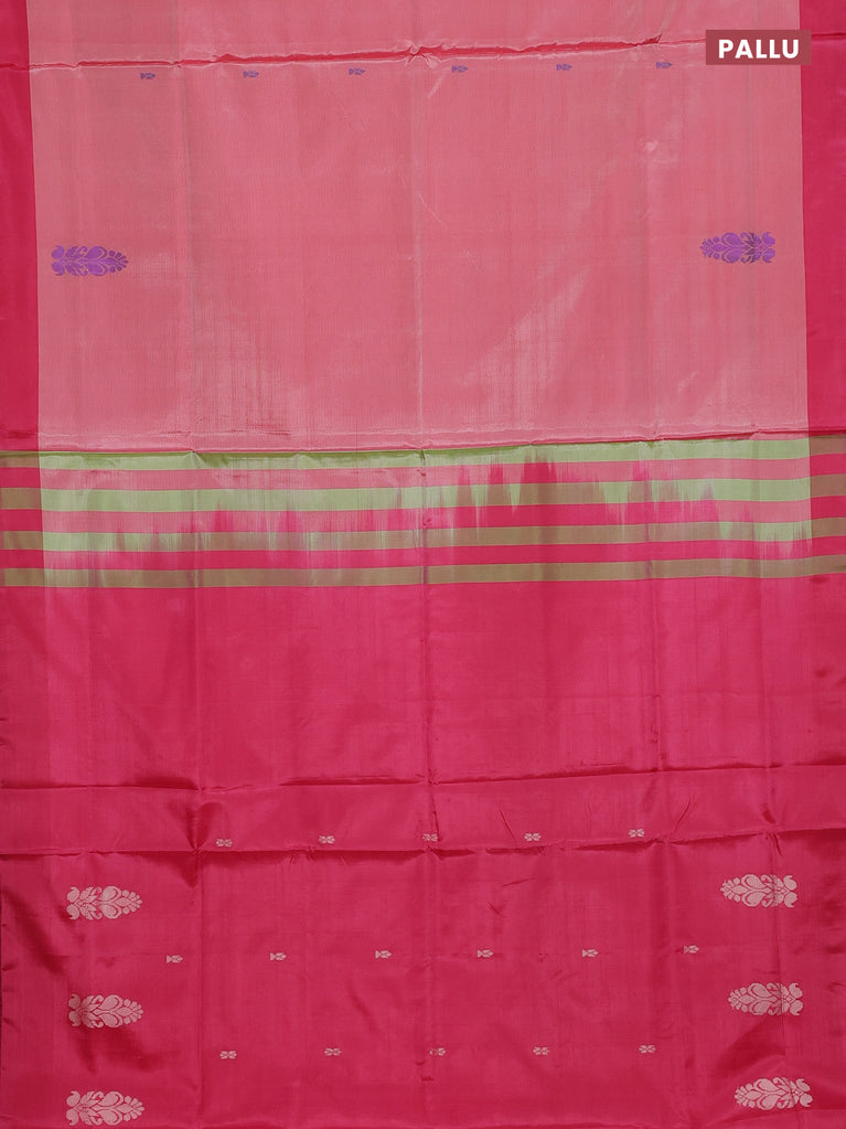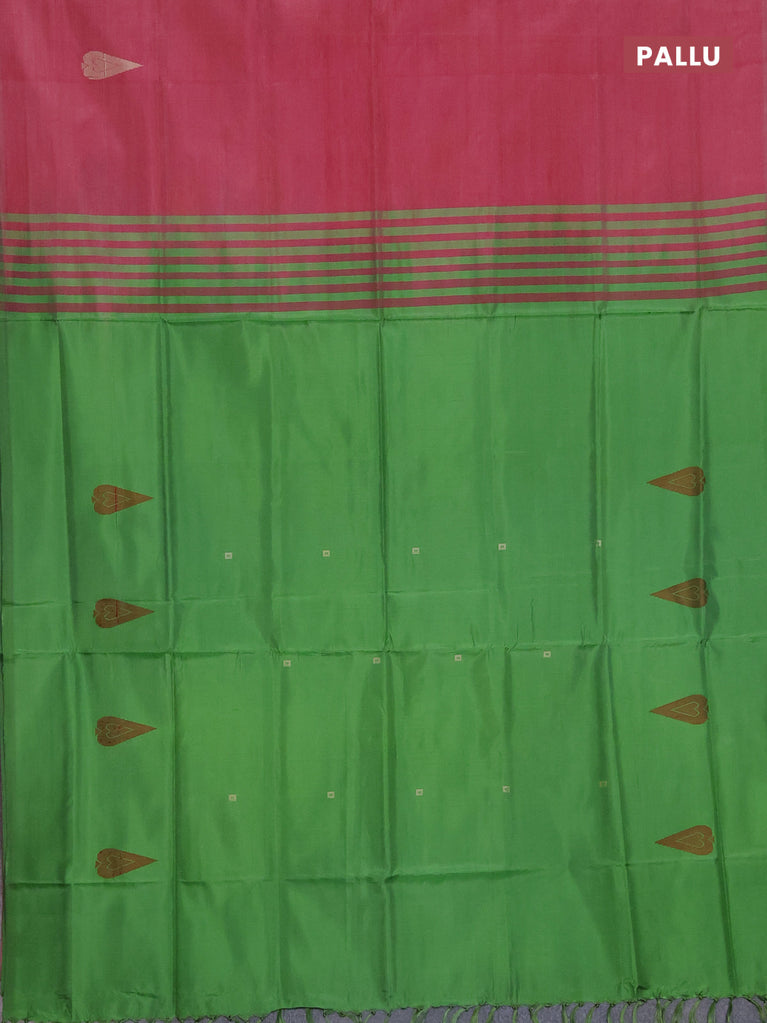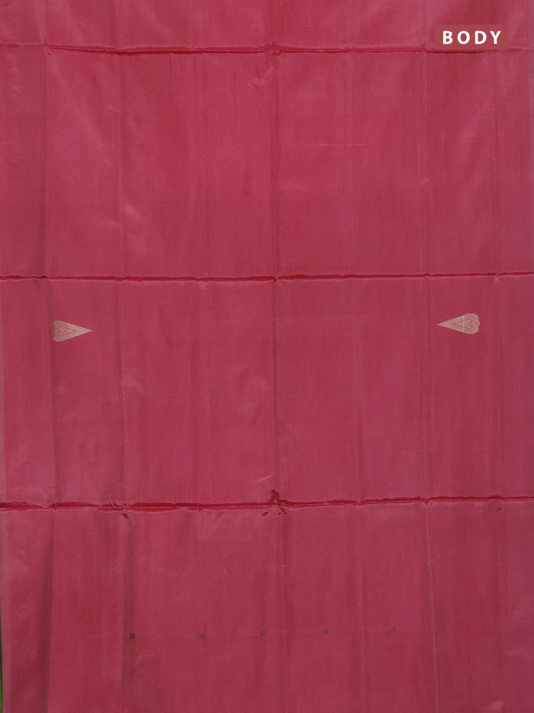 Banana pith saree peach pink and sap green with thread woven buttas in borderless style
