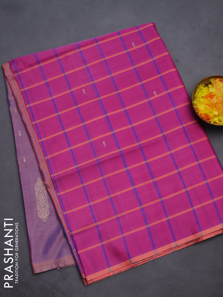 Banana pith saree purple and dual shade of peachish lavender with allover checked pattern and piping border
