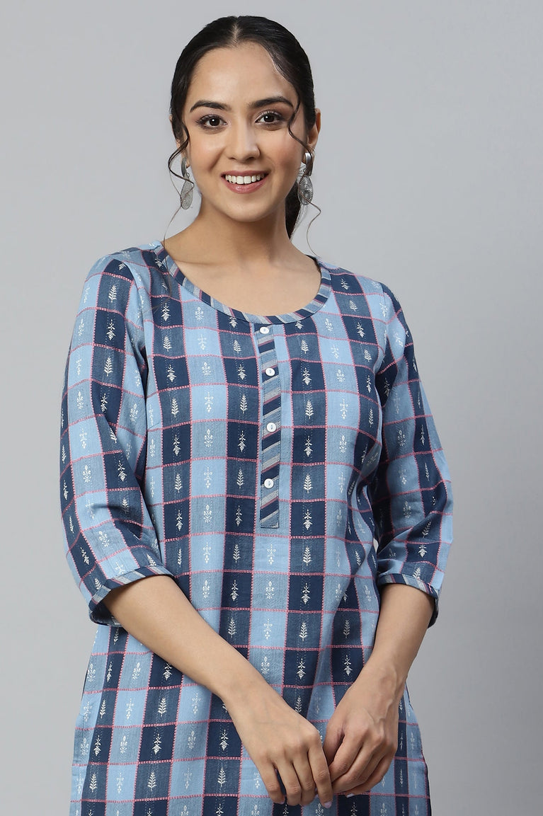 Blue dobby kurta in round neck and 3/4th sleeves paired with blue flared palazzo pants in elasticated waistband and mid-rise.