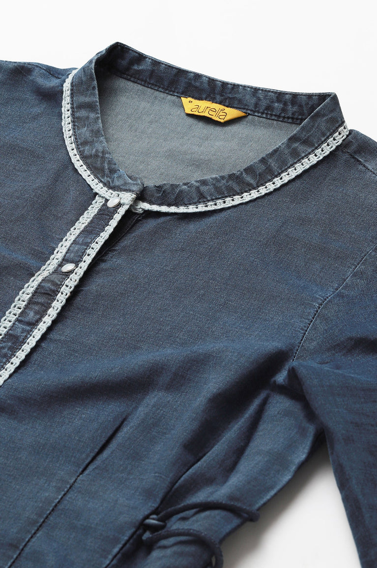Give Your Casualwear Wardrobe An Uplift With This Denim Short kurta. Not Only Does It Look Smart, The Fabric Also Feels Comfortable. It Features A Mandarin With A V-Neckline And A Mock Placket. Its 3/4Th Sleeves Are Enhanced With Contrast Stitch Lines. Contrast Piping With Thread-Work Gives It A Smart Casual Look.