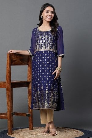 A classic straight fit kurta in blue printed fabric, highlighted with a beautiful embroidery & trims. It is paired with contrast Red palazzo and a conrasting printed dupatta.
