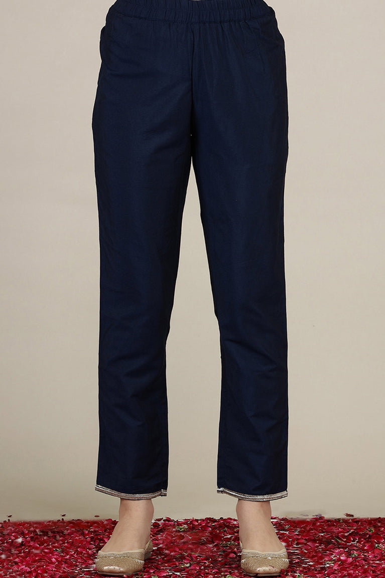 Denim Narrow Pants In Ankle Length Having Mid-Rise And Partially Elasticated Waistband. This Solid Trouser Has A Front Fly With Zipper And Button Closure Along With Front Patch Pockets For A Smart Look.