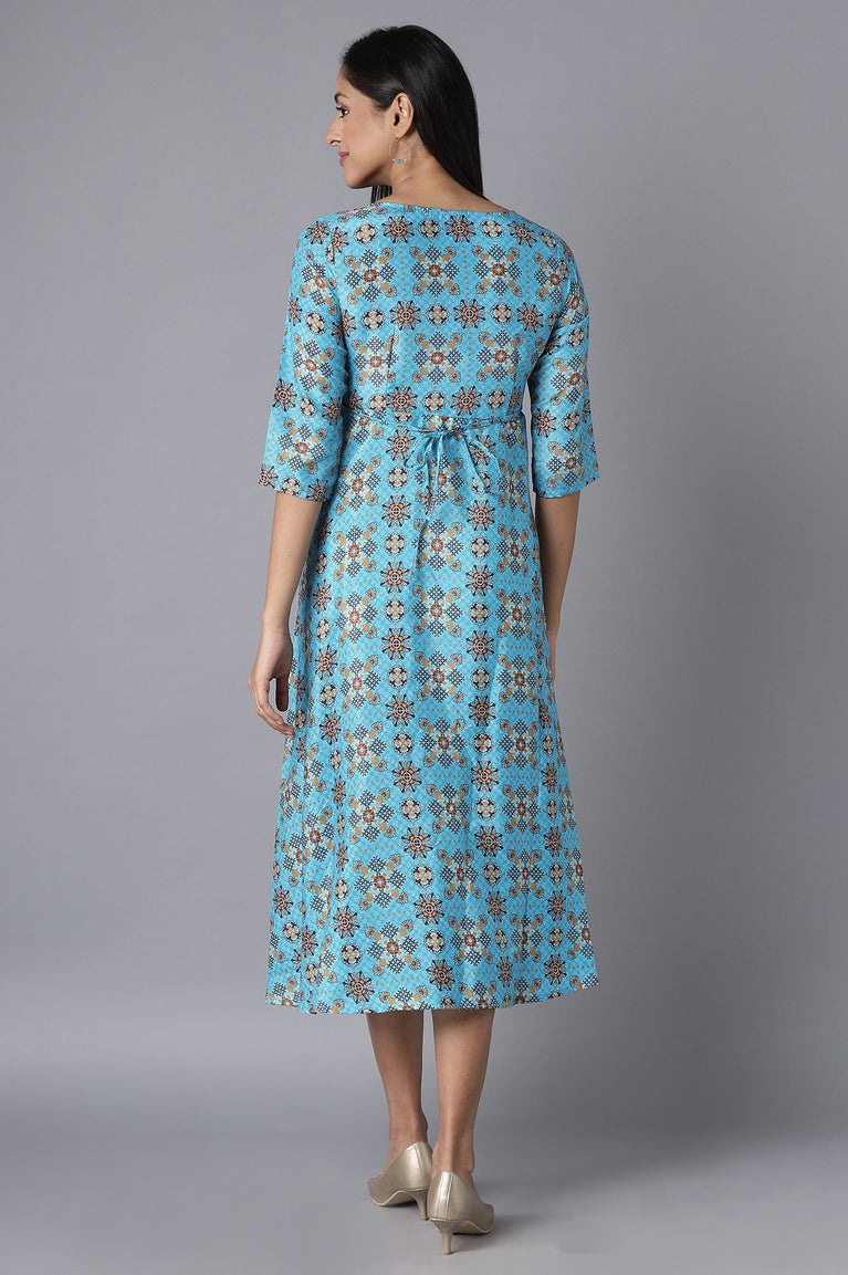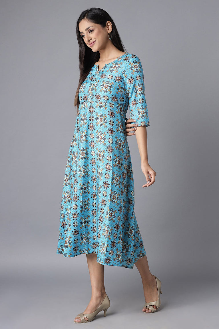 Doll up and swirl in fashion with this stunning blue flared dress in gathered body details and ankle length. The dress crafted in american crepe and has floral print and gold mandarin collar with button closure.