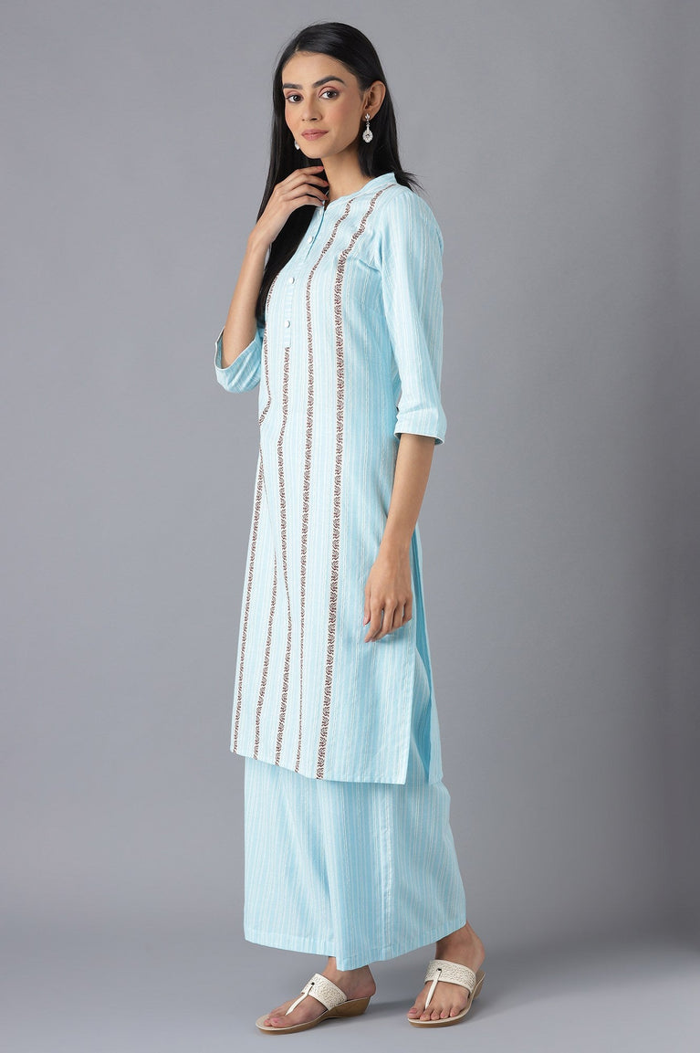 Blue coloured solid straight kurta having zari embroidery, round neck type and three-quarter sleeves.
