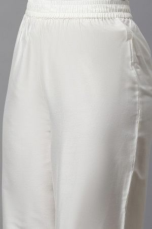 Chic ensembles designed to make you look gorgeous on the upcoming festivities. It features a blue glittered geometric print kurta having zari and thread embroidered round neck and three-quarter sleeves. Well-matched with ankle length slim fit solid trousers.