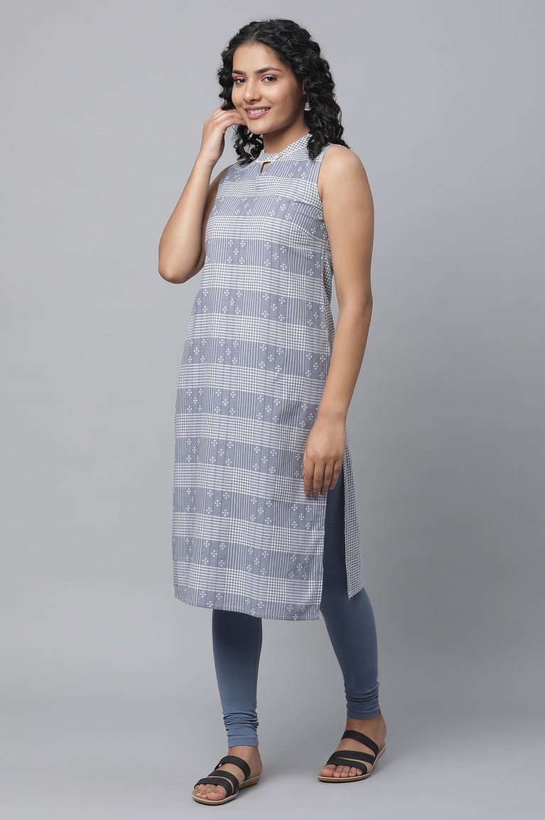 Effortlessly stylish, this sleeveless straight kurta has a mix of gingham checks and dobby in the front. It has a modern neckline that features an overlapped band collar. The kurta is paired with contrasting grey straight fit trouser pants.