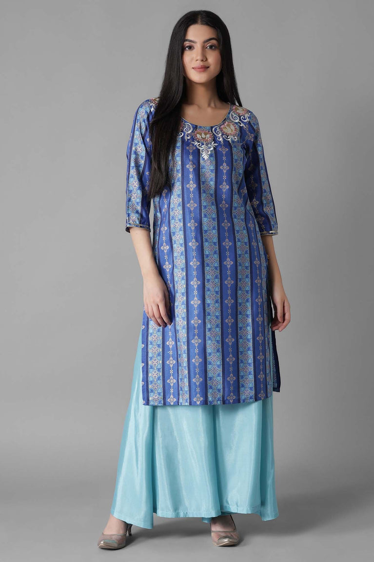 Blue Floral Printed Straight Kurta with Zari Embroidery