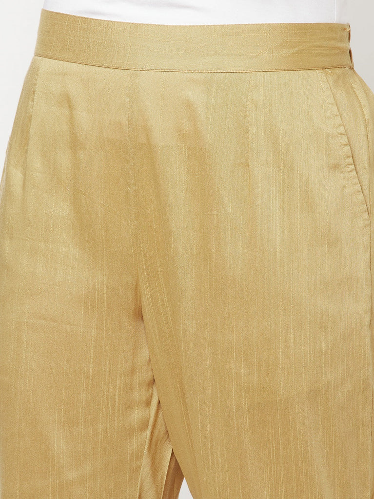 Get styled for the light festive event in this stunning set. The set has blue printed kurta round neck with button closure. It is paired with gold trouser pants.