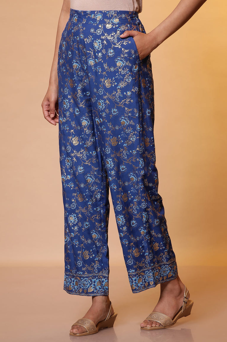 Blue Floral Printed Straight-fit Cotton Palazzo with Button Detail
