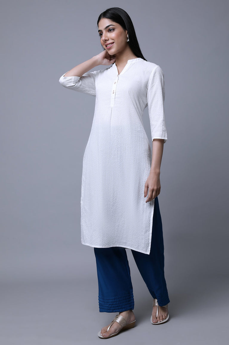 This Exquisitely Designed Two Piece Cotton kurta Set Is An Absolute Must-Have This Season. This Modern Print kurta Is Crafted In Premium Cotton Fabric And Features A V Neckline With Piping Insert And Button Details. It Is Coordinated With Yarn-Dyed Tonal Stripe Printed Narrow Palazzo.