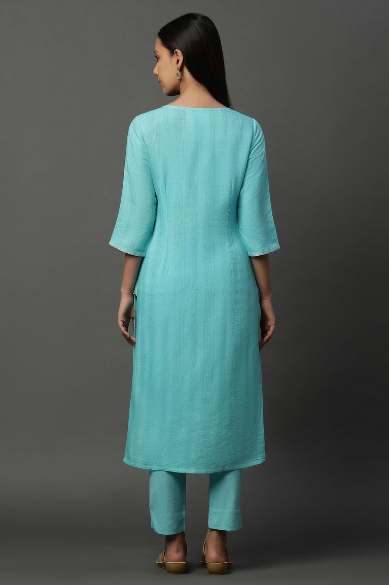 This blue mandarin neck 3/4 sleeve kurta has roll-up tab detail on the sleeve with button and keyhole detail and side slits.