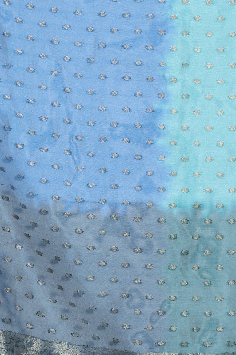 Blue Printed Zari Embroidered Crop Top, Brocade Flared Skirt and Dupatta Set