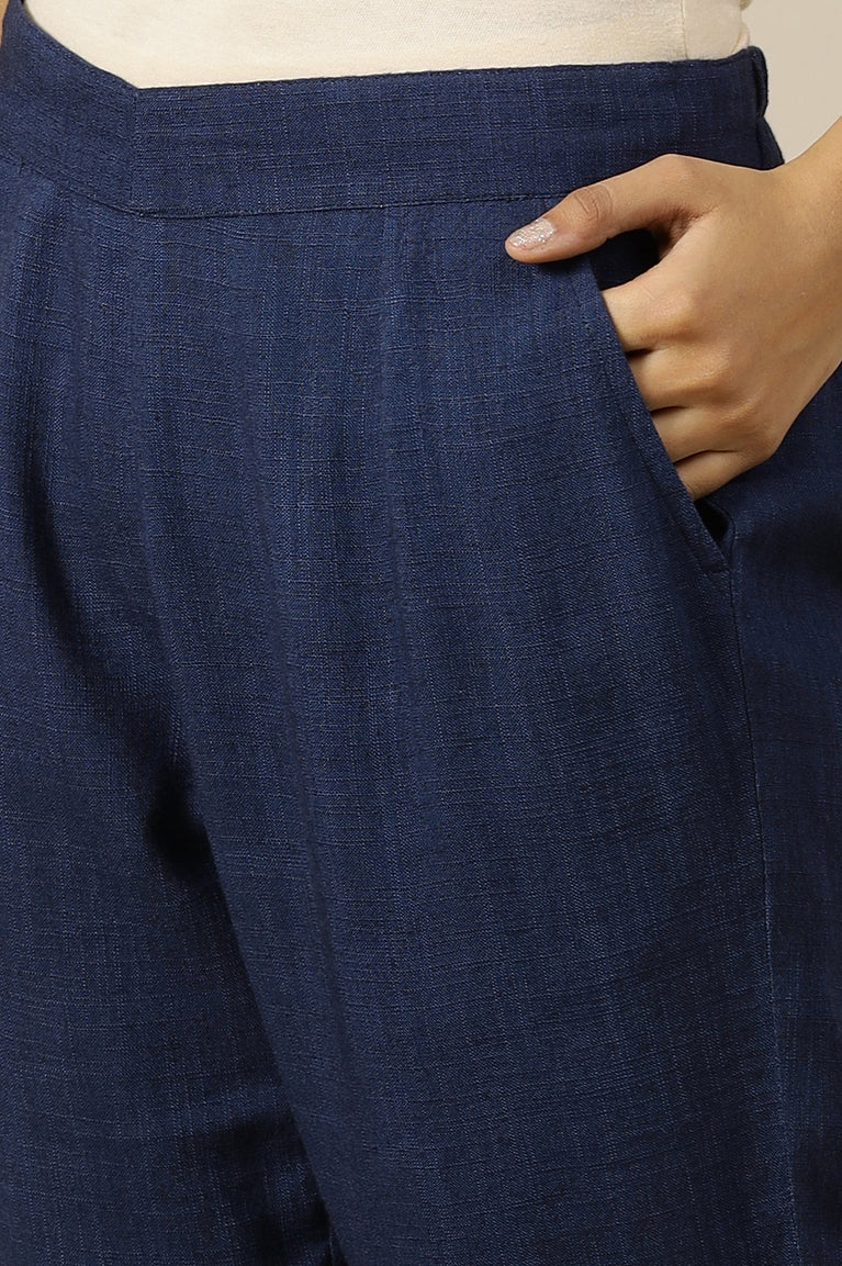 Experience the perfect blend of comfort and style with these blue casual trousers. Crafted from 100% cotton, these ankle-length trousers feature a mid-rise and partially elasticated waistband for a secure fit. The solid pattern and straight hem add a chic touch, while the two front pockets offer practicality. Ideal for a relaxed yet polished look, pair these trousers with a kurta and flats for effortless elegance.