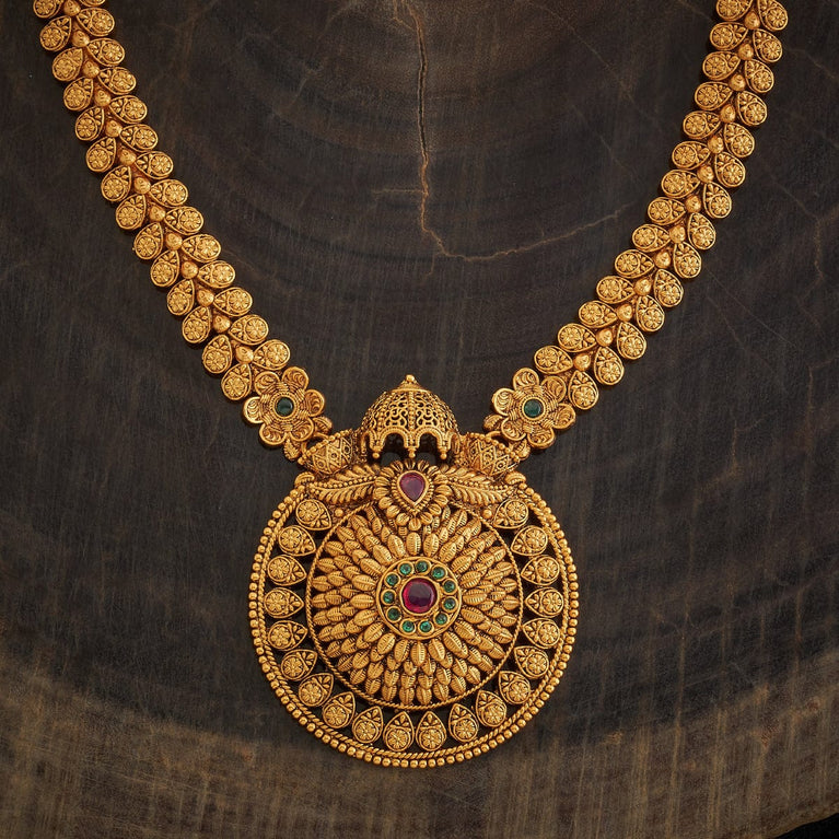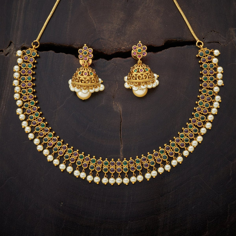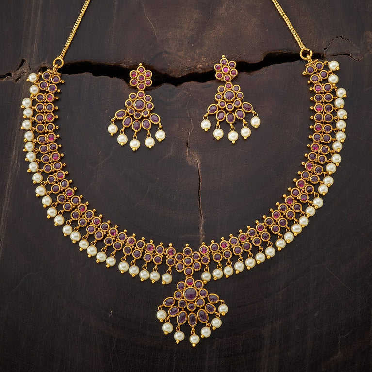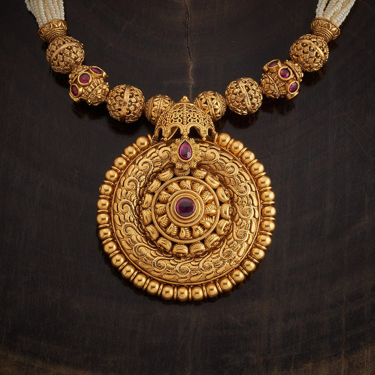 Kushal's Fashion Jewellery Antique NecklaceJewellery is the favorite element among women, boosting your looks and self-assurance. Antique jewellery has become a trend lately. Make your impression long-lasting with this ancient and classic piece of antique necklace. This piece is intricately designed, gold-polished and studded with ruby stones, demonstrating a masterpiece of the vintage era.