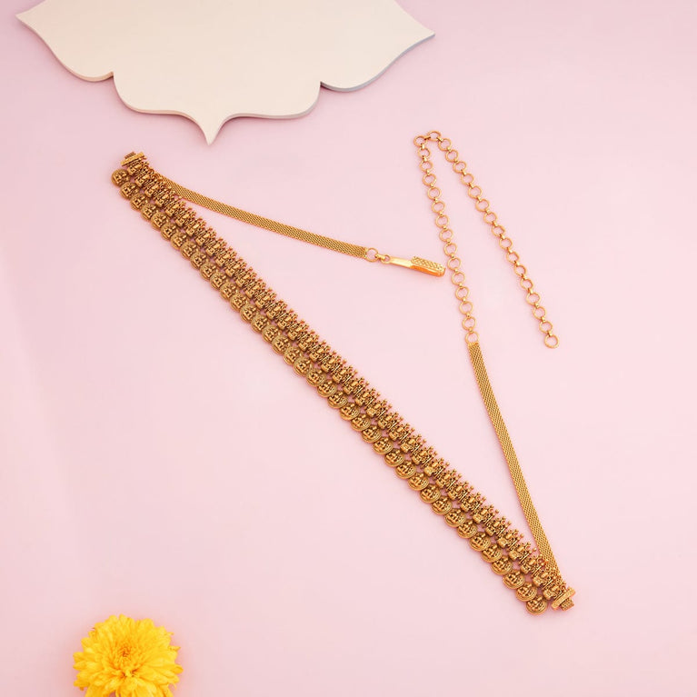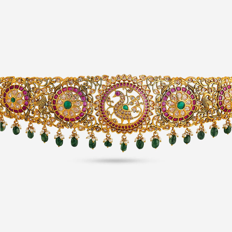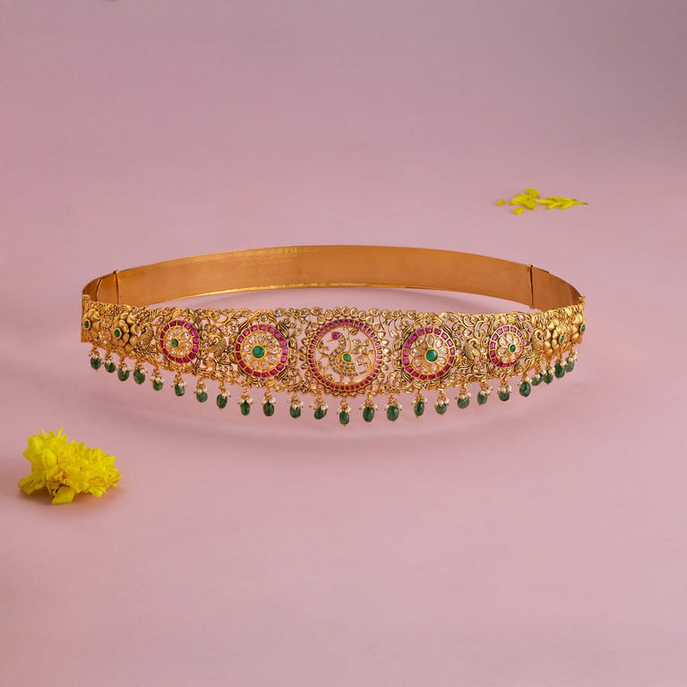 Kushal's Fashion Jewellery Flower Motif Antique BeltIf you are looking for a belt to match the elegance of your ethnic outfits, take a look at our latest antique belt with gold polish on the green and ruby stones. The eye-catching work details on this belt allow it to blend with all outfits and occasions. Grab yours now.