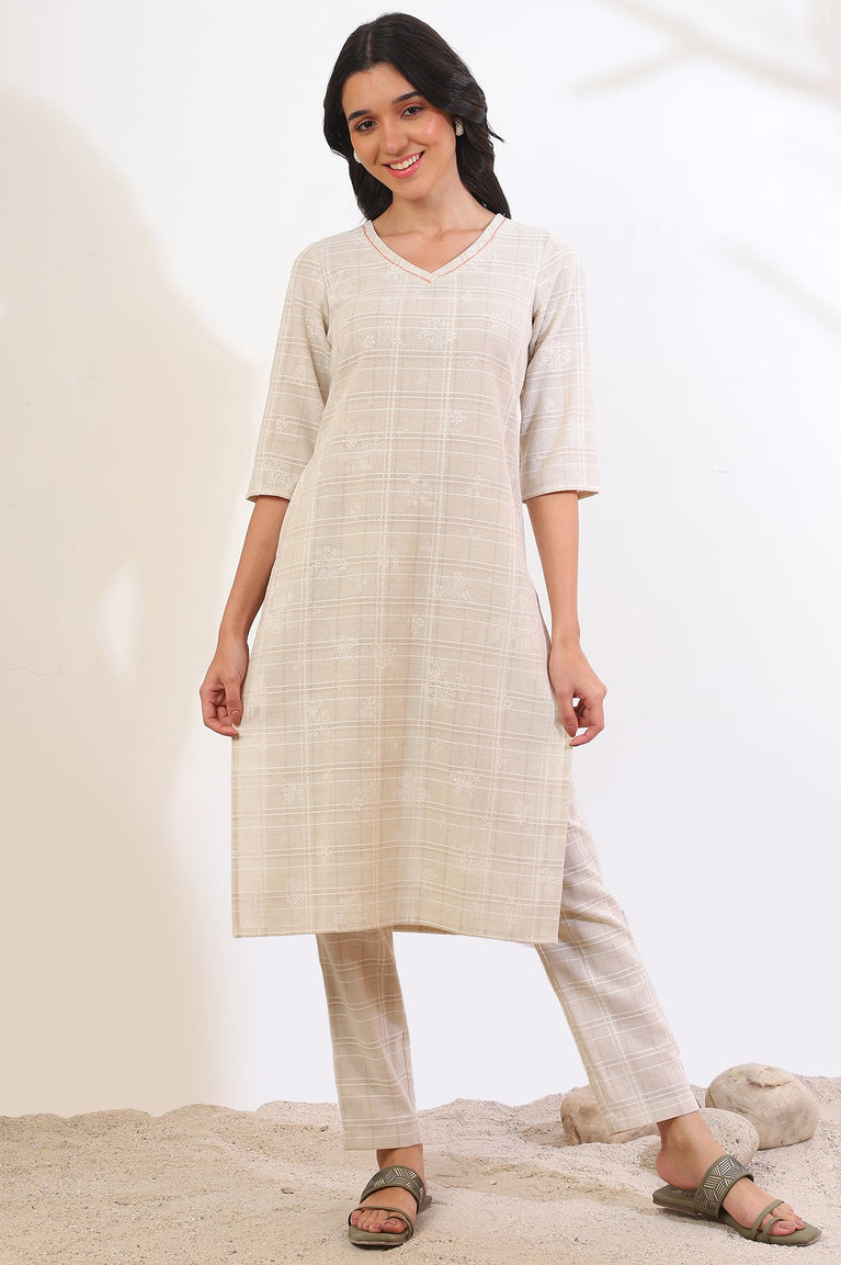 Beige Yarn Dyed Straight Cotton Blend Kurti