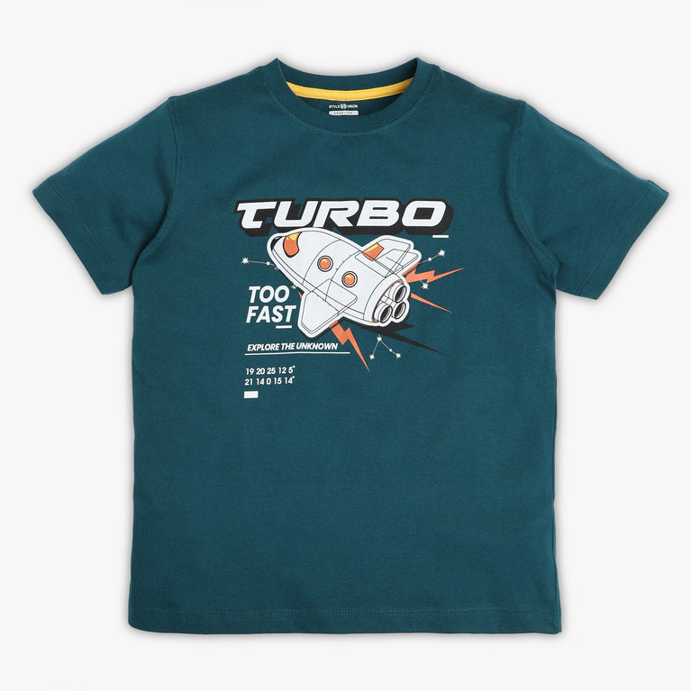 This graphic pattern t-shirt has a crew neck and half sleeve. Made from cotton, your kid's feel comfortable wearing the product.