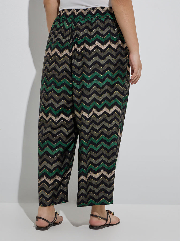 Step into supreme comfort and distinctive style with these black ethnic pants from Diza. Fashioned from a luxuriously soft fabric, they promise ultimate wearability. Their elasticated waistband and adjustable drawstrings ensure a bespoke fit, while the captivating chevron print elevates their design.