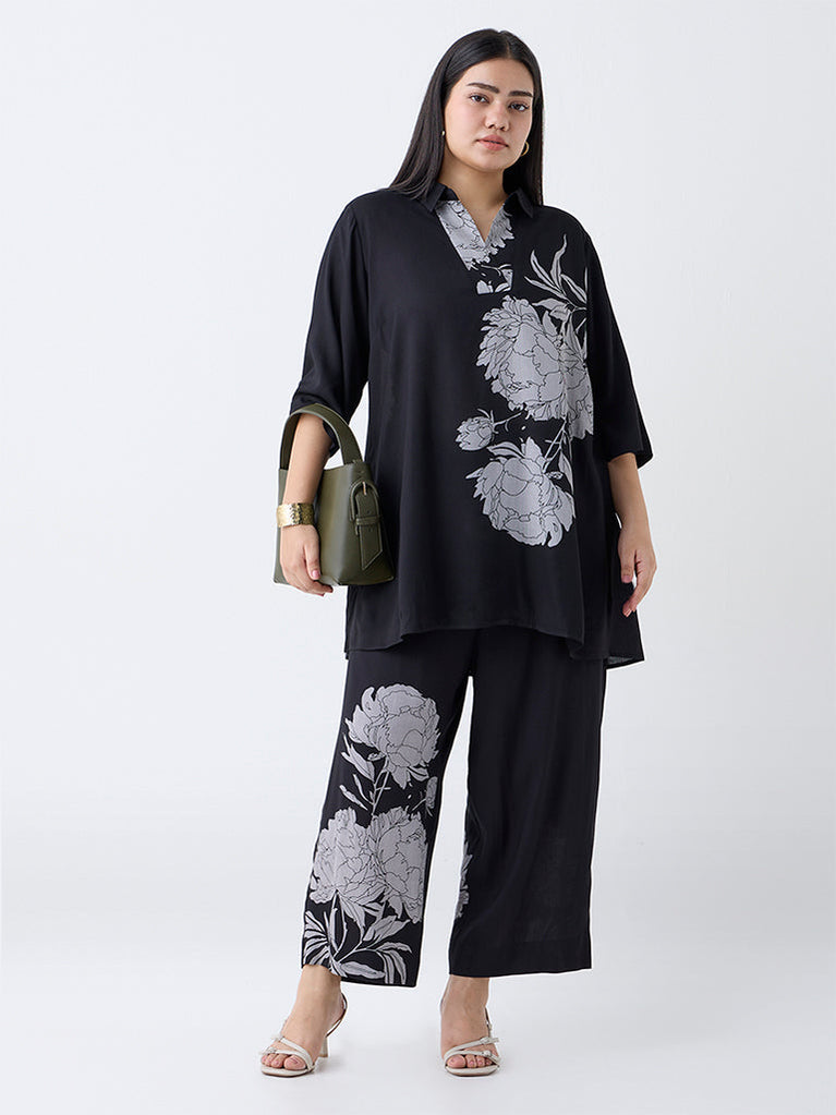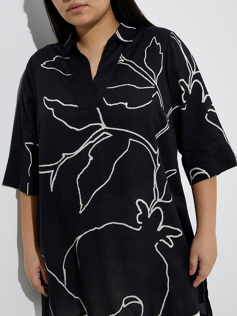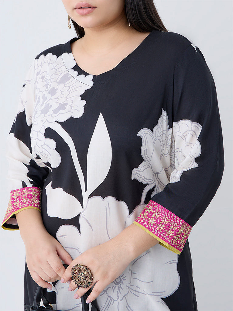 Diza brings you this charming black A-line kurta, featuring graceful floral prints that add a hint of femininity. Styled with a refined spread collar leading to a brief button-down front, three-quarter sleeves, and convenient side pockets, it combines effortless elegance with practical design.
