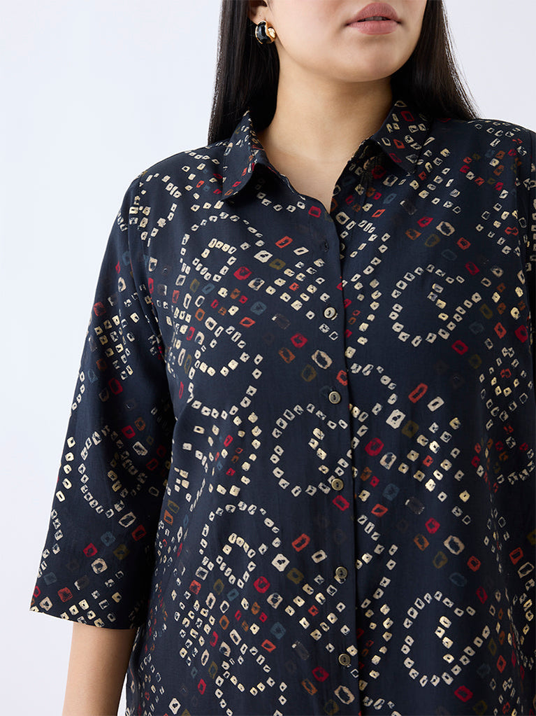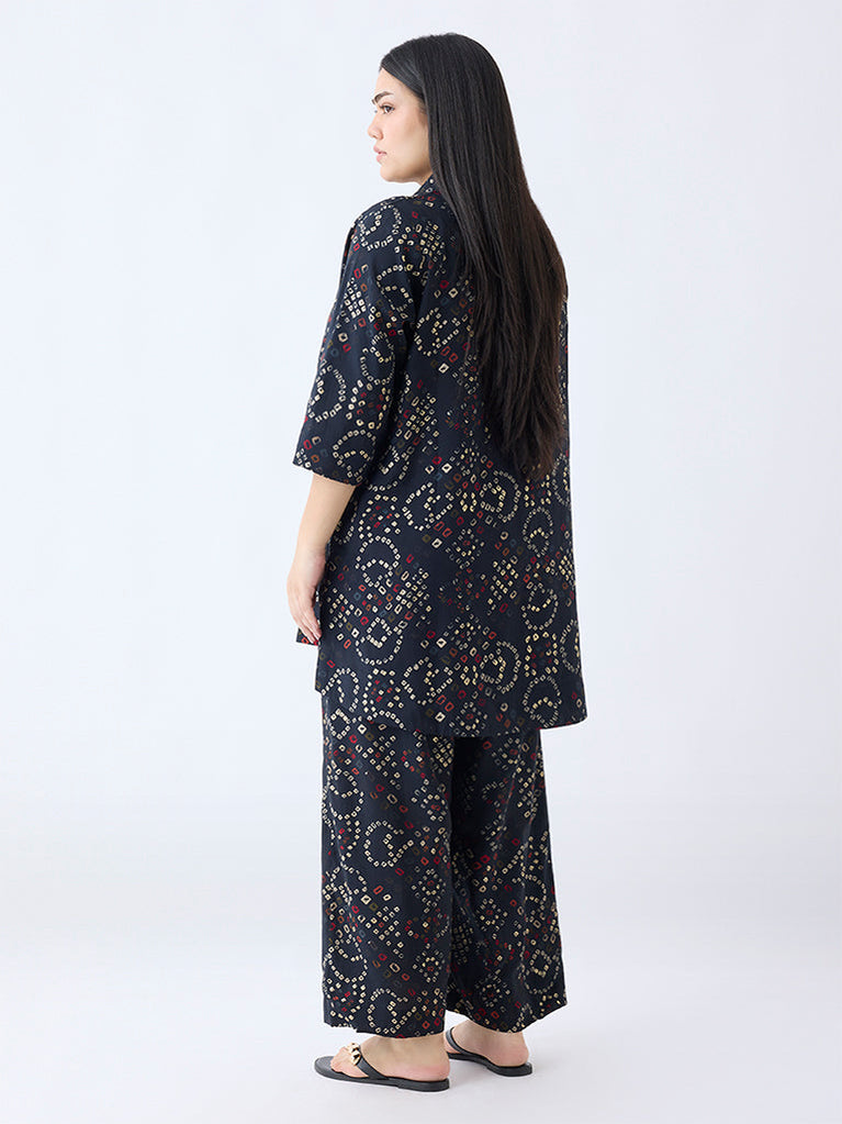 Perfect for everyday wear as well as festive days, this black tunic from Diza will redefine your ethnic edit. Flaunting bandhani-inspired geometric prints, this high-low style gives a chic look with matching palazzos (sold separately)