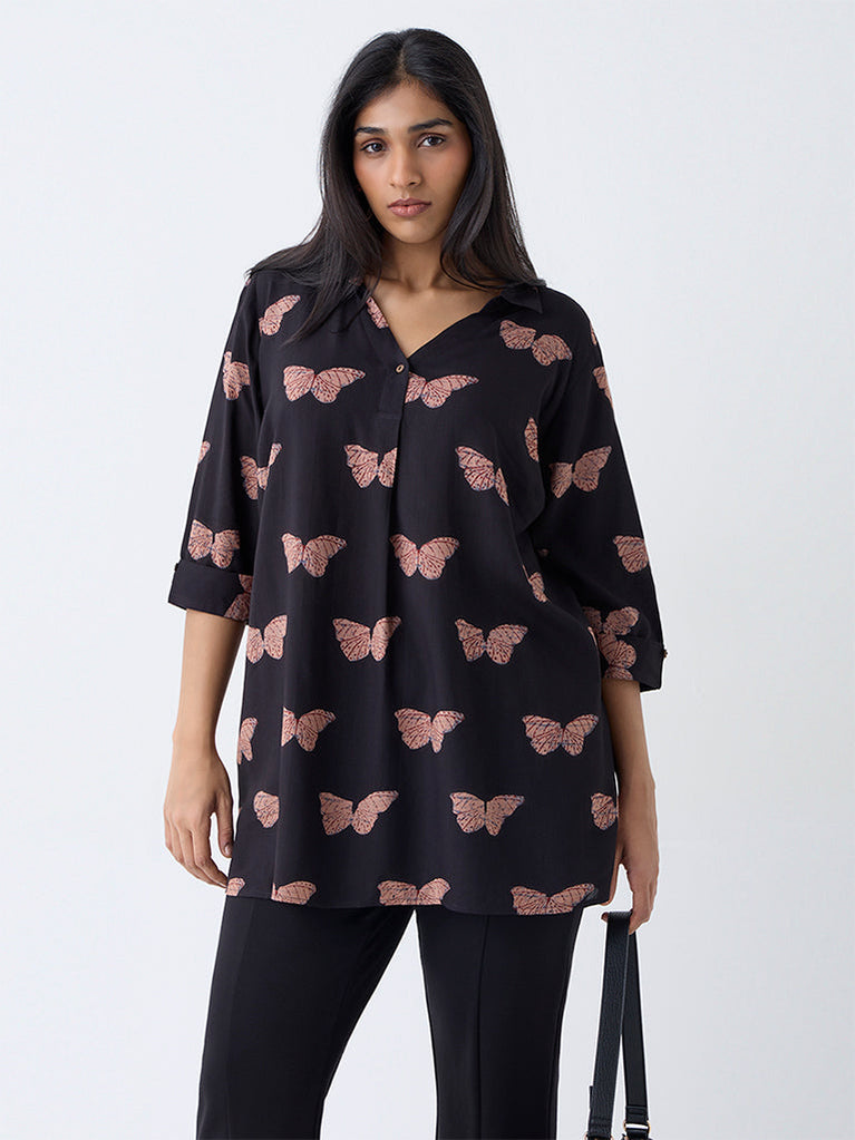 A contemporary ethnic design, this black tunic from Diza exhibits butterfly prints all over a minimalist frame. It is framed with a V-neck, button placket and three-quarters sleeves. Spun from soft, breathable fabric, it offers effortless comfort and a refined edge for everyday dressing.
