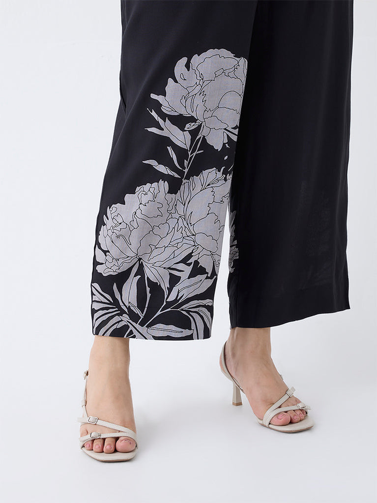 Infused with a nature-inspired charm, these black ethnic pants from Diza feature a botanical print that adds a lively touch. Designed with a smooth elastic waistband and adjustable drawstrings, they ensure a secure yet comfortable fit for all-day ease.