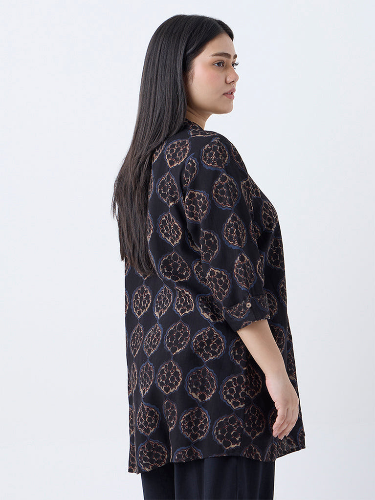 Quietly expressive, this black tunic from Diza is adorned with all-over foliage prints that add timeless charm. Cut from a lightweight fabric that drapes smoothly, it features a spread collar and three-quarter sleeves—an easy, versatile pairing for relaxed ethnic separates.