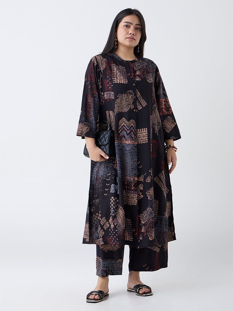 Diza Black Printed Quarter-Zip A-Line Kurta