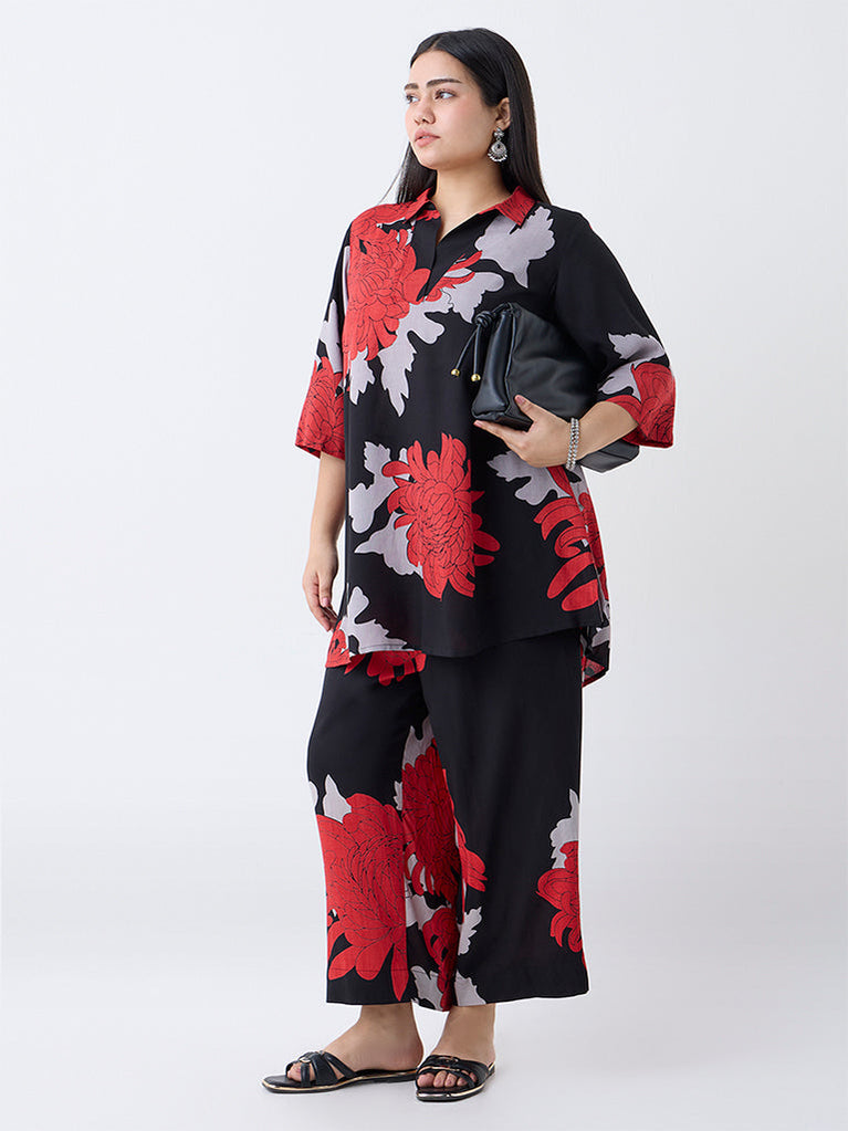 This black kurti from Diza is perfect for both casual and festive occasions. Designed with a flattering high-low silhouette in a smart shirt style, it boasts bold floral patterns for a touch of elegance. Pair with matching palazzos (sold separately) for a polished look.