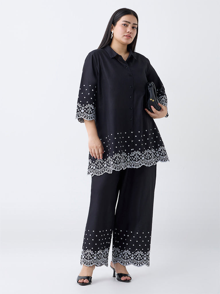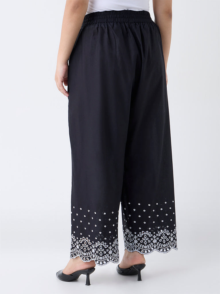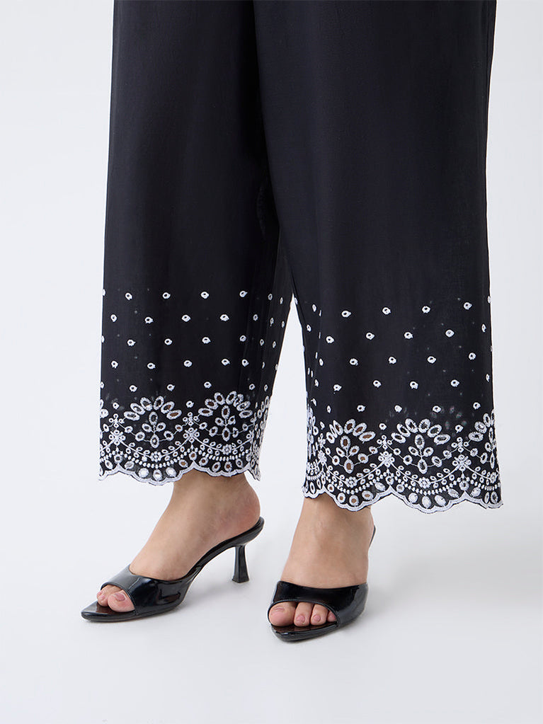 Diza Black Schiffli Embroidered Cotton Palazzos