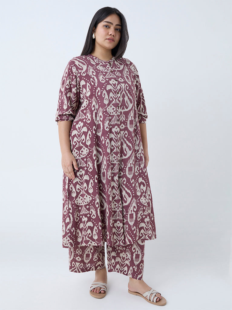 Add a touch of graceful charm to your wardrobe with this mauve kurta from Diza. Shaped in an A-line silhouette with all-over ikat patterns, it features a band collar, button placket, and three-quarter sleeves. The lightweight fabric ensures comfort, while a slip pocket adds everyday functionality.