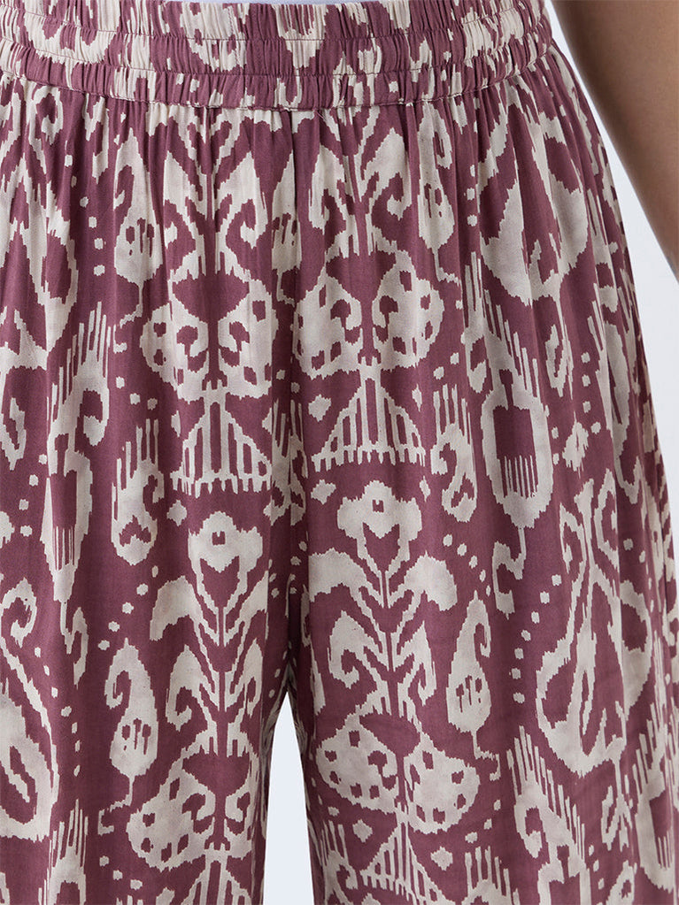 These mauve ethnic pants from Diza rework classic ikat with a modern sensibility. Cut from an ultra-lightweight fabric, they feature a fluid silhouette that moves with you. The smooth elastic waistband and adjustable drawstrings offer a flexible fit, while side pockets keep things practical.