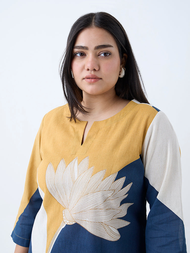 This navy tunic from Diza is brought to life with vivid floral embroidery that draws the eye to the front panel. Cut from pure cotton, it’s designed for breathability and all-day ease. The collared neck and three-quarter sleeves offer a balanced frame, while the high-low hem adds a graceful touch of drama to the relaxed silhouette.