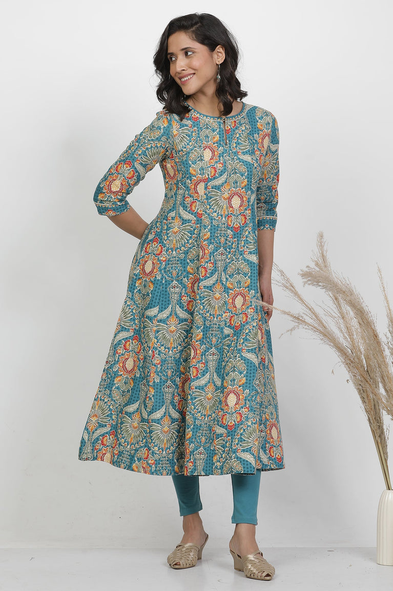 Blue Floral Printed Cotton Blend Straight Kurta And Pants Co-Ord Set